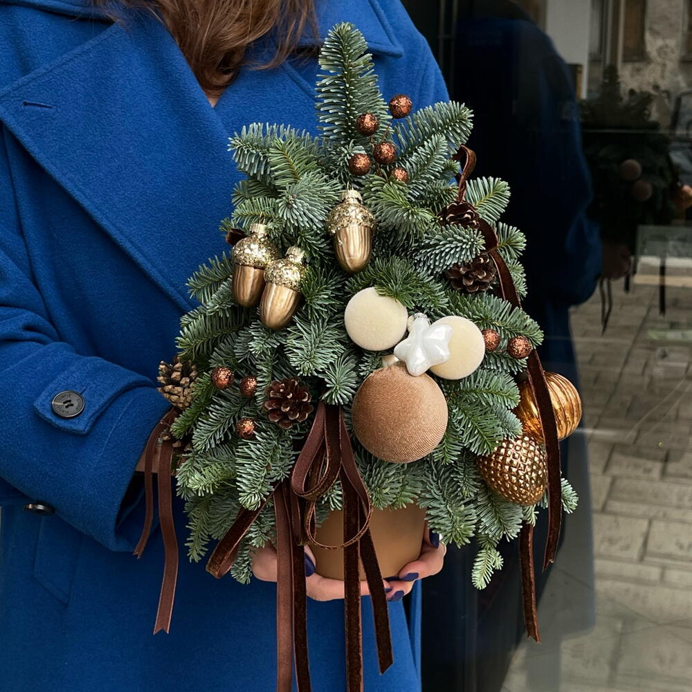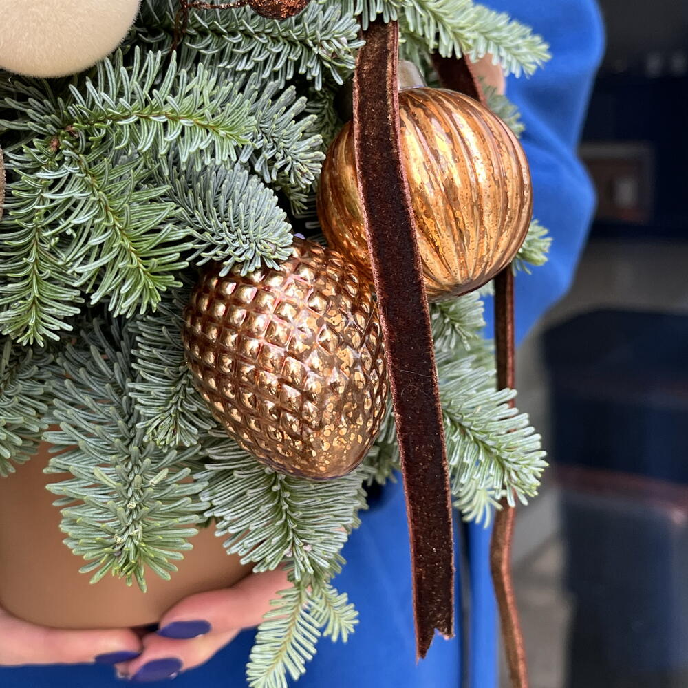 A decorative Christmas tree made of noble fir, the Danish blue fir that doesn’t shed. It is very long-lasting and will delight you throughout the entire holiday season. Perfect as a gift or as décor for any space.