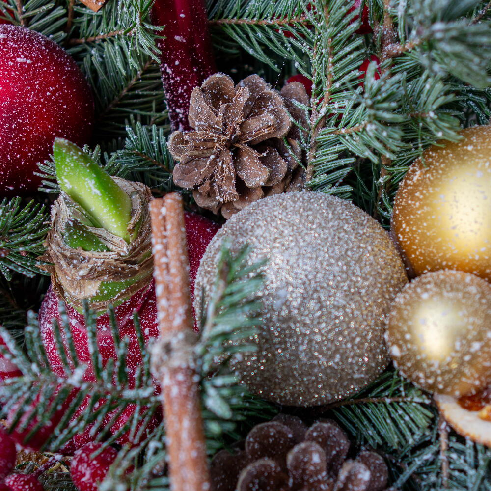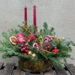 Nordic Flame Christmas New Year floral arrangement with amaryllis “Nordic Flame” is a warm and elegant holiday arrangement featuring a vibrant amaryllis bulb, fresh evergreen branches, golden and red ornaments, and decorative winter berries. The rich, glowing palette brings the feeling of festive lights, cozy evenings, and classic Christmas charm. This Christmas and New Year arrangement is perfect for a holiday table, a fireplace corner, or as a thoughtful seasonal gift. Created by Botanika.rs with fresh winter flowers and premium evergreens, this arrangement adds a refined holiday touch to any interior. A beautiful choice if you are looking for stylish Christmas decor or a New Year floral gift.