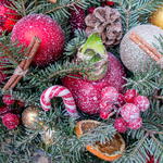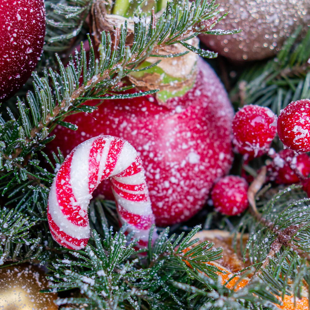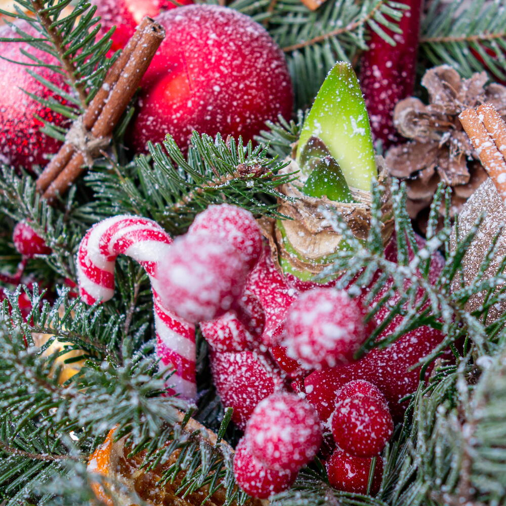 Moss - 1 un. Decoração - 1 un. frutas vermelhas - 3 un. amarílis - 1 un. vaso de vidro - 1 un. candy - 1 un. galhos de árvore de Natal - 3 un. velas - 2 un.