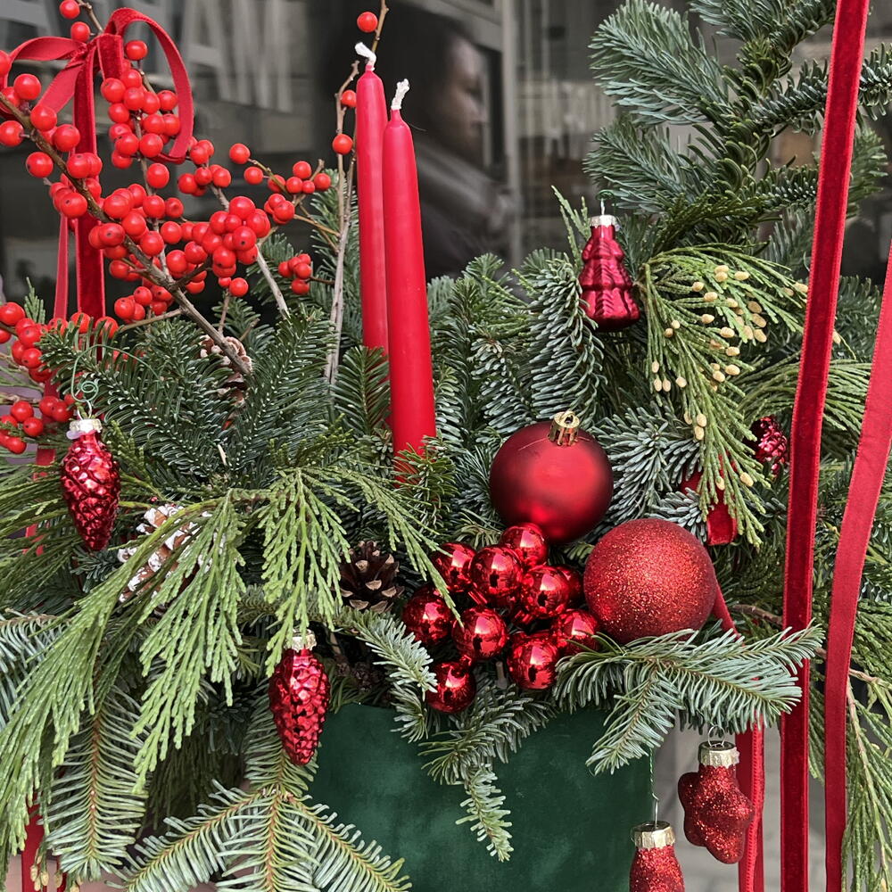 A long-lasting spruce arrangement with candles. The needles do not shed. The composition will delight you for over a month. The candles can be replaced with new ones when they burn down. An excellent option for a gift or as décor for any space.
