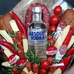 Tomate cereja - 150 gr. Pimenta vermelha picante - 5 un. Salsichas de caça - 150 gr. Pão de centeio - 2 un. salsicha de Cracóvia - 200 gr. palitos de queijo suluguni - 300 gr. babybel мини - 3 un. калбаса сыро-копченый - 250 gr. водка absalut 0.5l - 1 un.