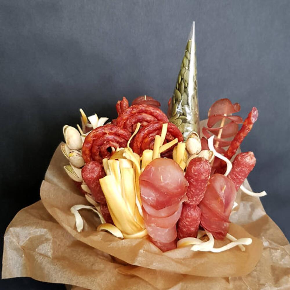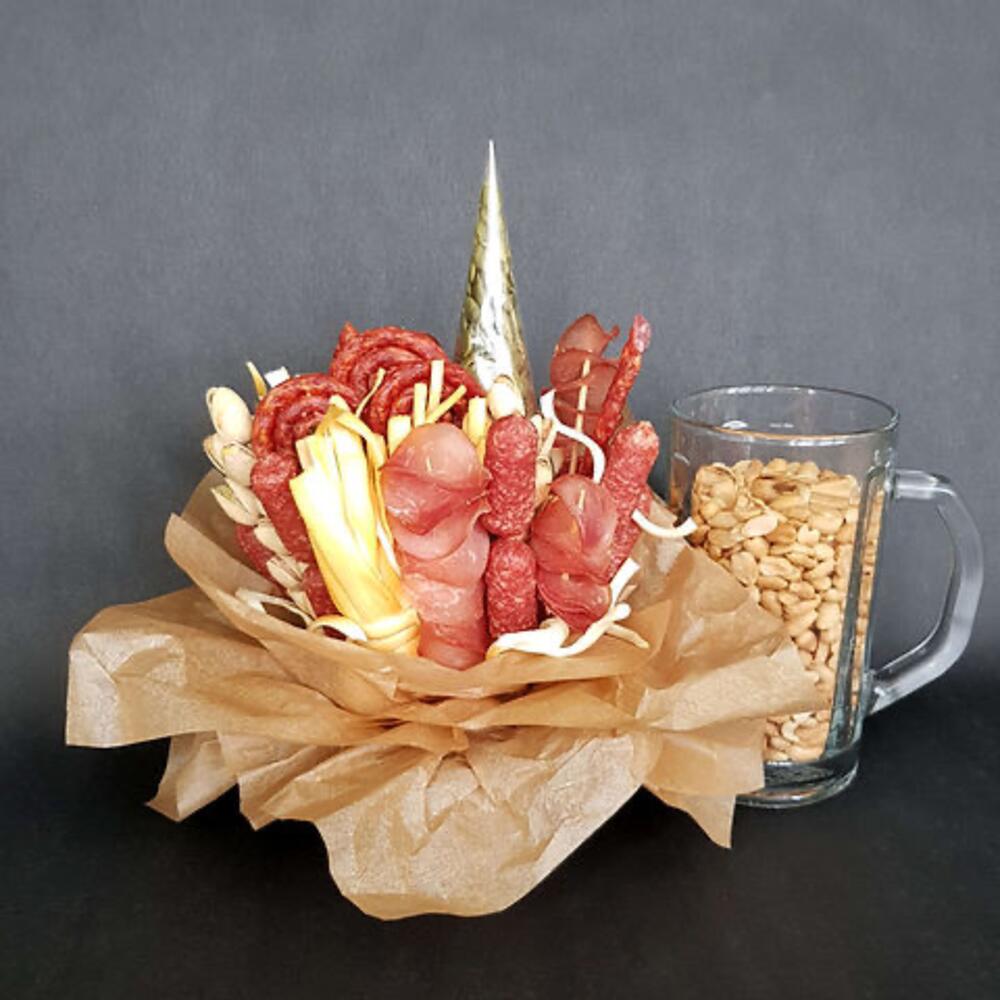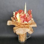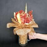 Этот мужской букет - олицетворение настоящего мужественного удовольствия. В его состав входит классический бокал из стекла, полный смачных мясных чипсов на шпажке. Помимо этого, поклонникам мясных изделий обязательно понравятся охотничьи колбаски мини. Сырной ноткой в букете станет копченая сырная косичка, которую хорошо дополняют круглые, с сытом набитые вкусом кнакеры. Из соленых удовольствий в букете присутствует сочный арахис - источник полезных жиров, а также палочки с запеченной колбаской. Как приятный десерт, в букет вложен пучок фисташек и в виде еще одного сюрприза - кулечек с очищенными тыквенными семенами. Этот букет - прекрасный, эксклюзивный подарок для любого мужчины, очень оригинальная и вкусная альтернатива обычным цветам!