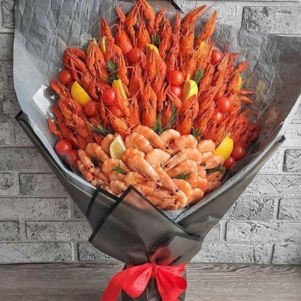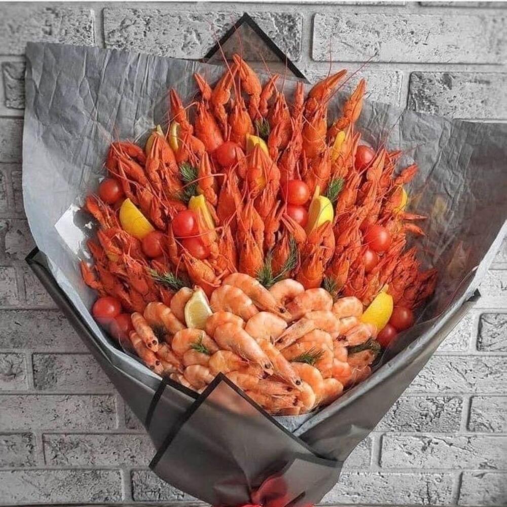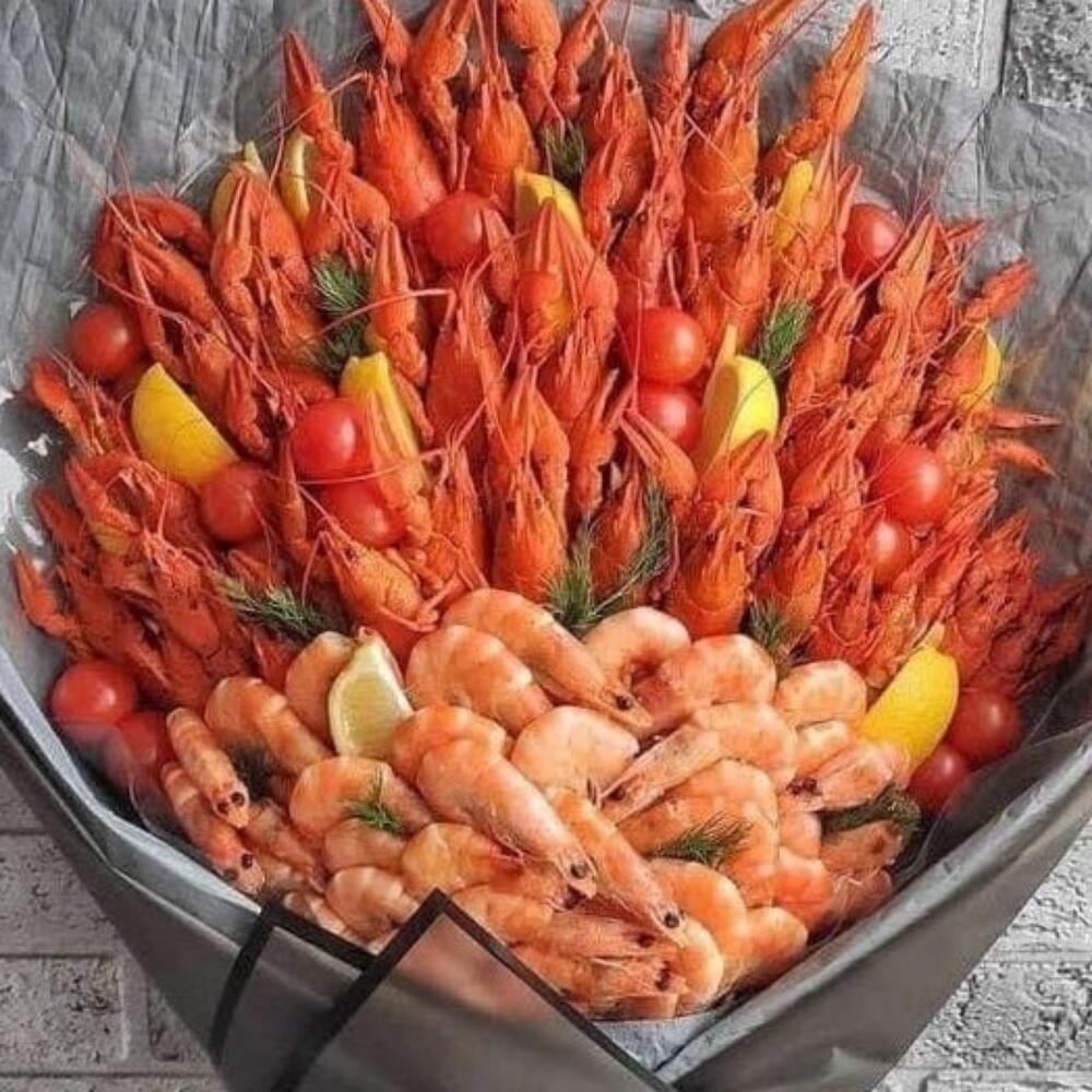 Морской каприз – оригинальный букет для истинных гурманов. В его составе: 50 сочных раков, 30 нежных креветок, свежая зелень, спелые помидоры черри и ароматные дольки лимона. Букет гармонично сочетает вкусовые оттенки и становится идеальным подарком для мужчины, который ценит изысканность и практичность. Подчеркните особенный момент этим ярким гастрономическим сюрпризом! Раки в букете весят 30-40 граммов каждый, что гарантирует их оптимальный размер и насыщенный вкус.