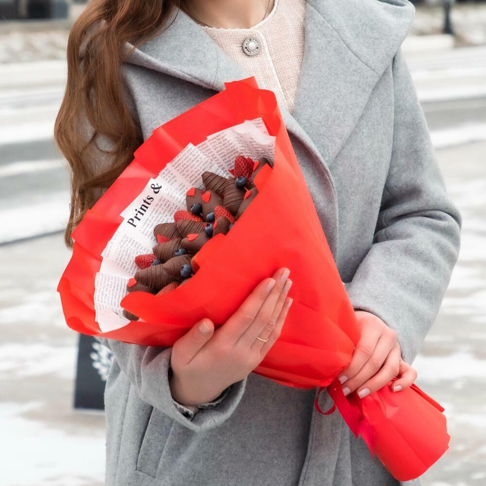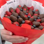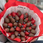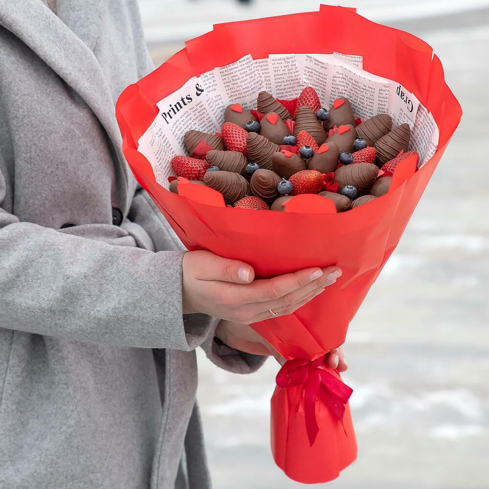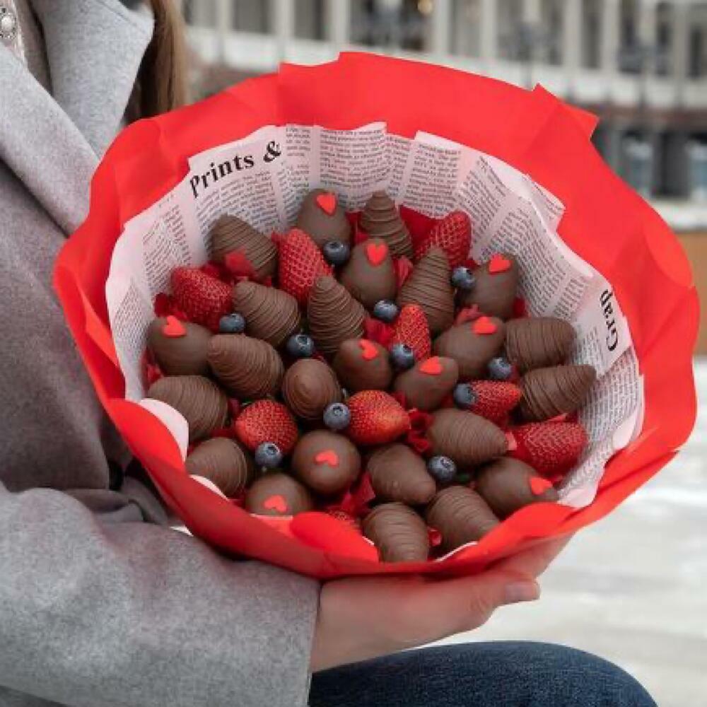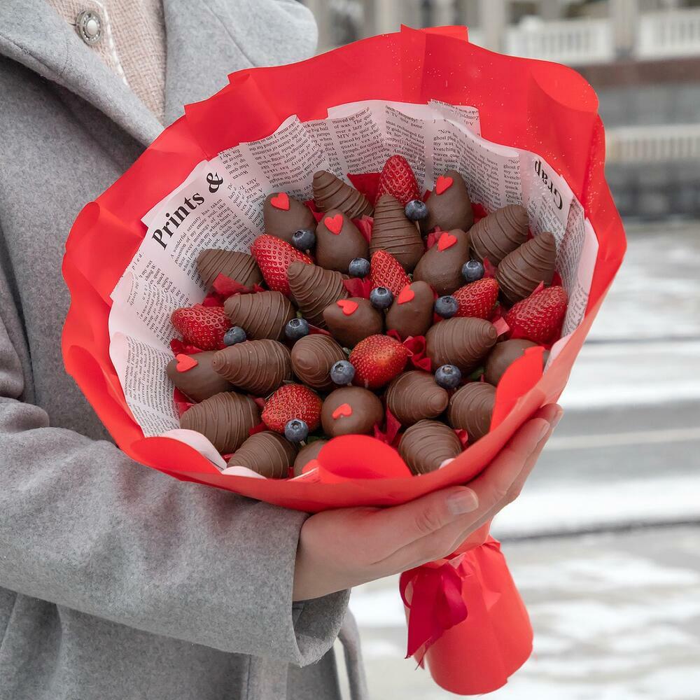 Подарите яркий сладкий подарок - букет из клубники в молочном шоколаде! Роскошный букет, нежно окутанный вкусом шоколада, голубики и клубники, а также красная и газетная подарочная упаковки подчеркнут романтическую атмосферу!
