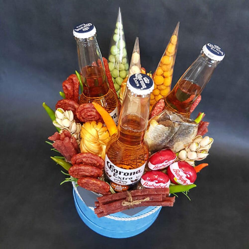 Этот мужской букет идеально подойдёт для любителя пикантных удовольствий и изысканных вкусов. В его состав входят основы для закуски: знаменитые в мире пивных атрибутов corona и babybel мини, уникальный кнакер и копченые колбаски, а также сушеная рыба для любителей необычных сочетаний. Чтобы добавить немного остроты в жизнь, в букет включены упаковки арахиса со вкусами васаби и креветки. И конечно же, не забыто о сыре косичке и двух связках фисташек для утонченных гурманов. Дополняет все это острый перец - отличный акцент и украшение этого неповторимого мужского букета.