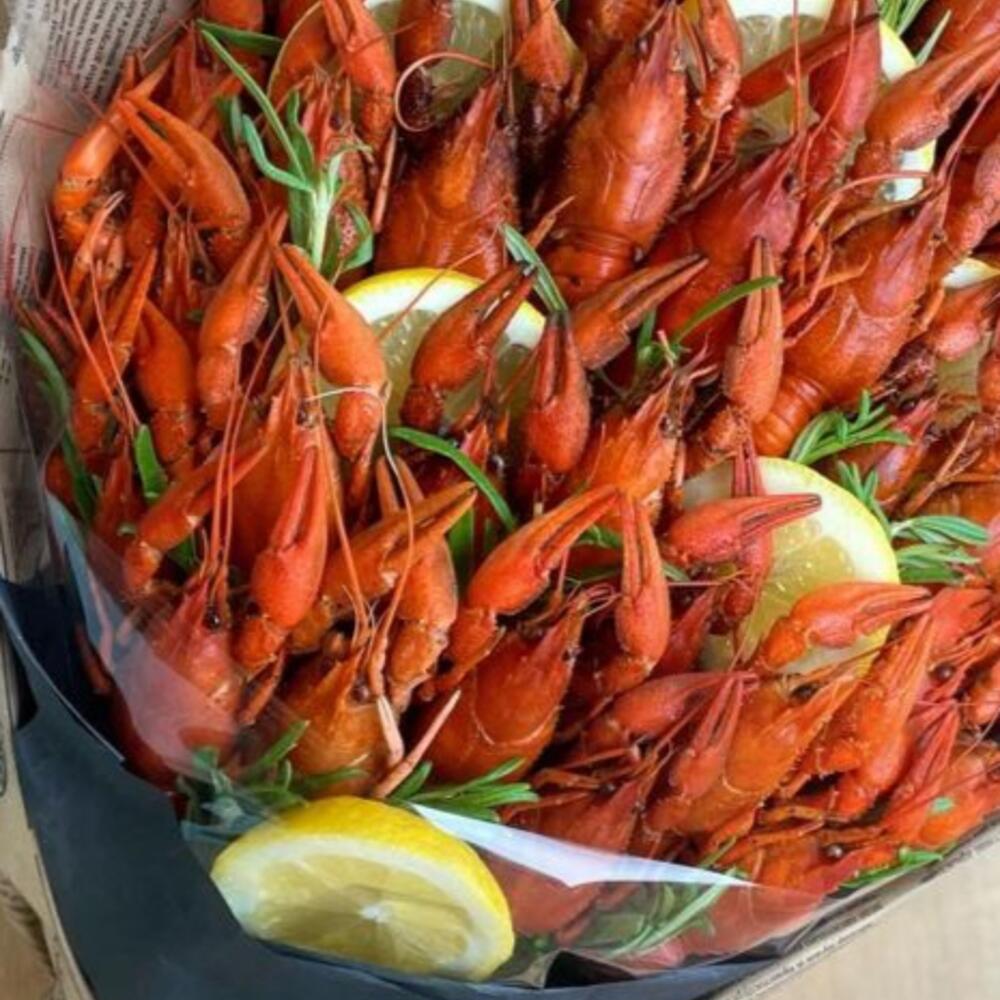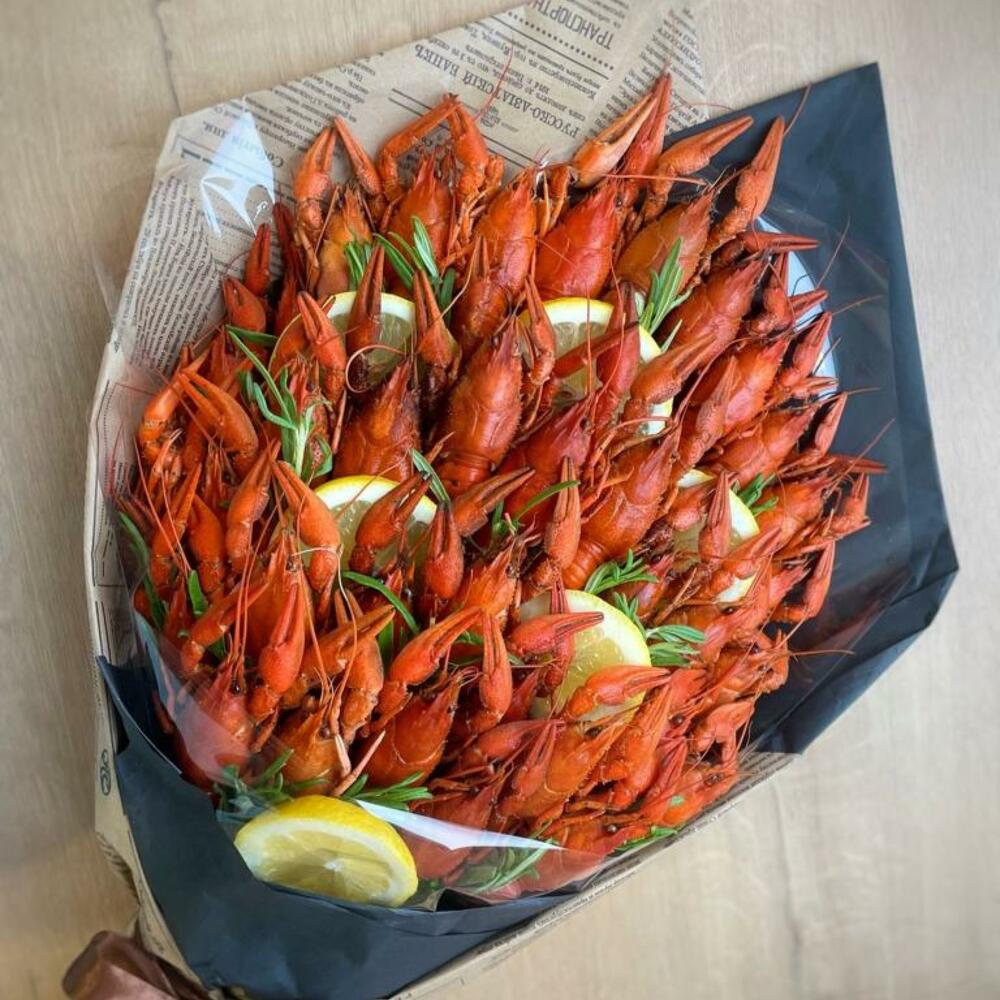 Этот оригинальный букет — настоящий праздник для любителей морепродуктов! Сочные, ароматные раки, красиво уложенные и дополненные свежими дольками лимона и веточками розмарина, создают эффектный и аппетитный вид.