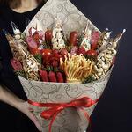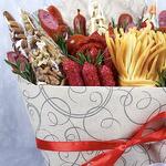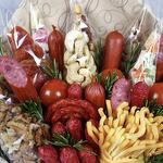 Съедобный букет для гурманов — праздник вкусов и текстур в одном подарке! Здесь собраны хрустящие орехи, пикантные колбаски, сочные томаты и нежный сыр, завернутые в изящную упаковку с яркой алой лентой. Каждая деталь подобрана с любовью: ароматные веточки розмарина добавляют свежести, а разнообразие ингредиентов — универсальность. Такой букет идеально подойдёт для мужчины или женщины, кто ценит оригинальные и вкусные сюрпризы. Лучший способ выразить внимание с ноткой кулинарного шика!
