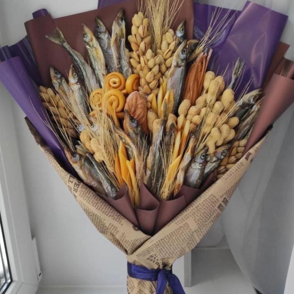 Вместо традиционных цветов в композиции использованы копченная рыба, различные виды сыра, арахис и фисташка. Такая идея букета подходит для подарка любителям пенного напитка, закусок и оригинальных презентов. Он выглядит эффектно и стильно, сочетая в себе эстетику и гастрономическое удовольствие.