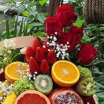 Morango - 8 un. Rosa - 5 un. Granada - 1 un. Kiwi - 1 un. Laranja - 1 un. Bombom - 3 un. Toranja - 1 un. verde decorativo - 1 un. banana - 6 un.