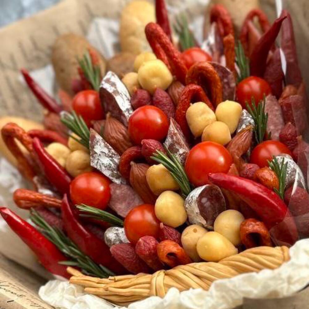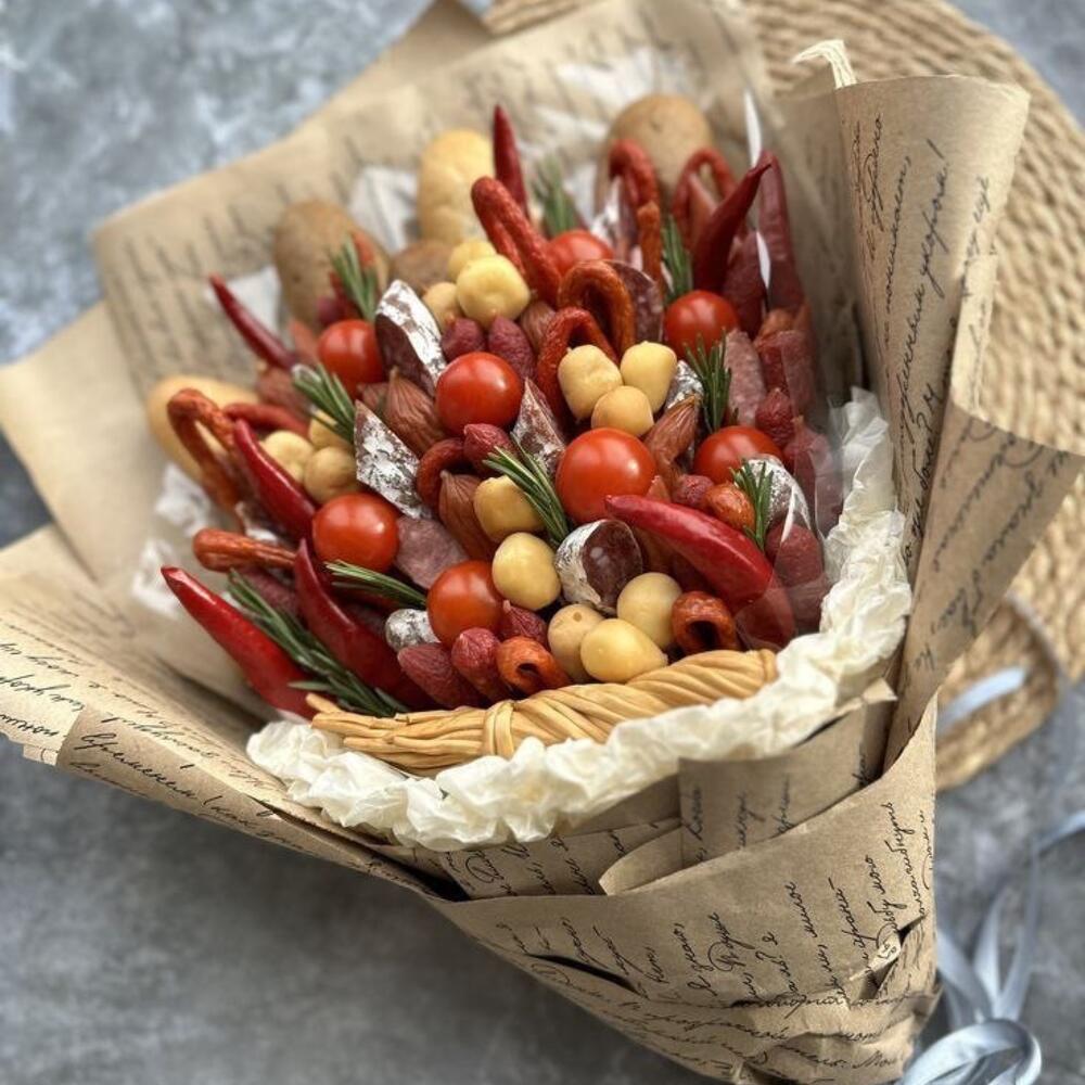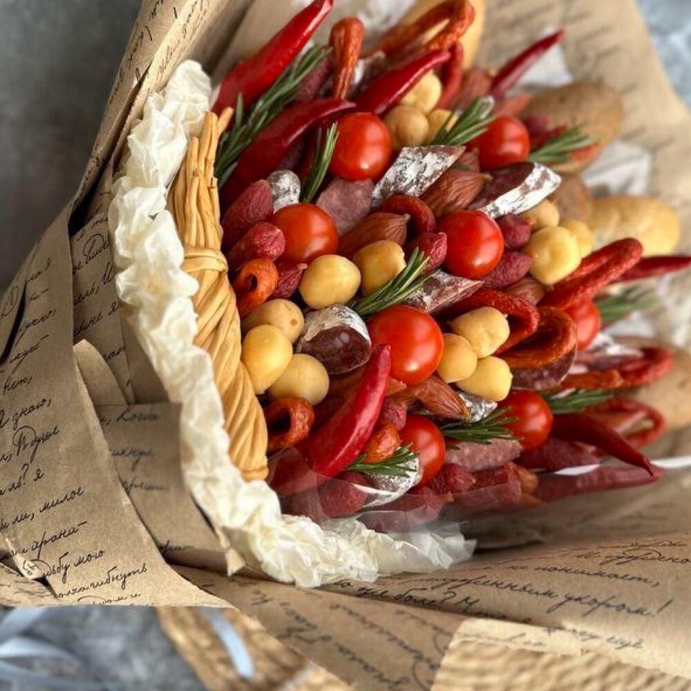 В этом букете — идеальное сочетание пикантных колбасок, ароматных сыров, сочных томатов черри и острых перчиков.Каждая деталь продумана, чтобы удивить, насытить и порадовать. ⠀ 🌿 Украшен веточками розмарина и упакован в стильную крафтовую бумагу — подарок, который говорит громко и со вкусом. ⠀ Идеально для: 🥃 Настоящих мужчин 🎉 Праздника с друзьями 💥 Необычного сюрприза
