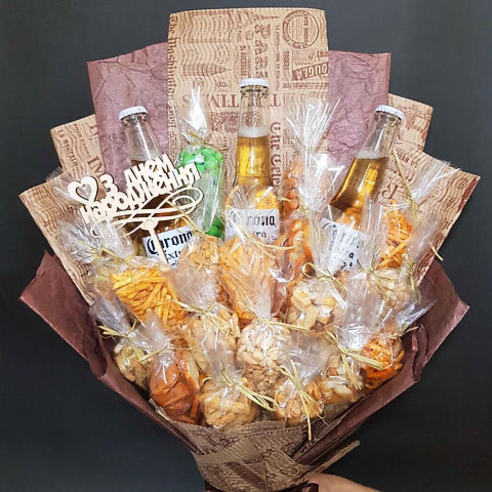 Этот мужской букет – идеальный подарок для истинного гурмана! Состоит из трех бутылок знаменитого пива Corona, три пакетика соленого арахиса, который прекрасно дополнят вкус напитка. Для поклонников экзотики в букет включен арахис со вкусом васаби, а любителям классики обязательно придутся по вкусу арахис и сухарики со вкусом сыра. В букете также есть три пакетика сухариков со вкусом шашлыка и тройной запас любимых всеми чипсов. Этот букет станет отличным подарком на любой праздник или просто приятным сюрпризом для любимого человека.