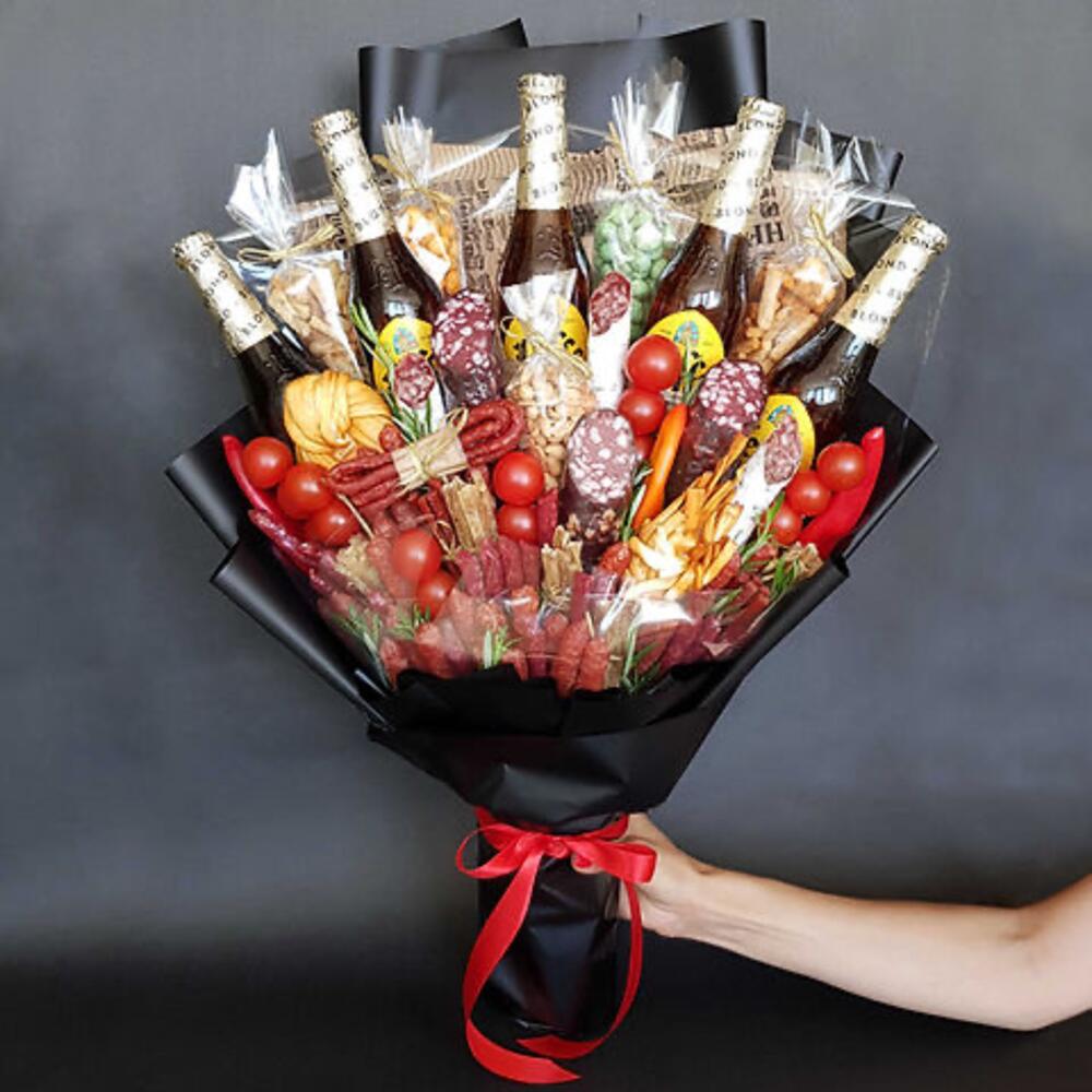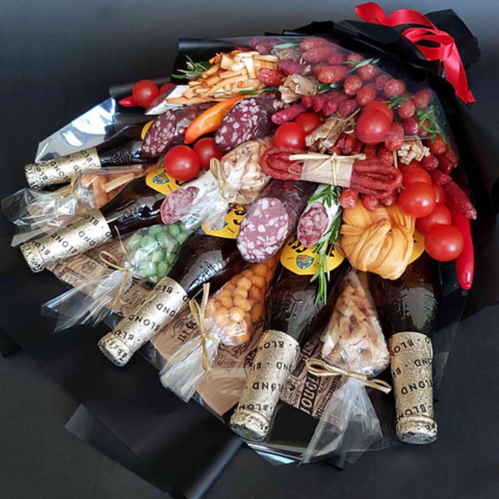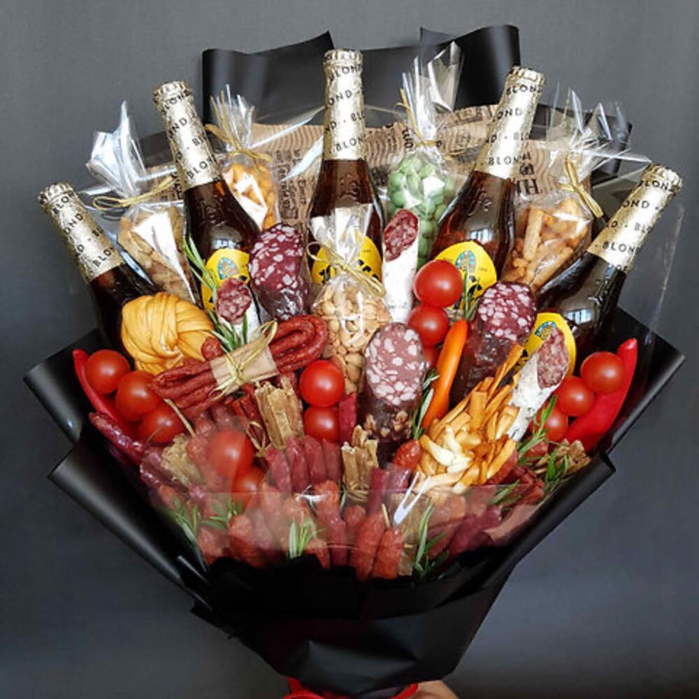 Этот эксклюзивный мужской букет - настоящий гастрономический праздник, который подарит настоящее удовольствие каждому современному мужчине. Он содержит пять бутылок ароматного пива Leffe, разнообразные виды мини-колбасок и сыро-копченую калбасу для тех, кто любит пикантные вкусы. Черри помидоры добавят свежести, а три вида соленого арахиса и сухарики прекрасно дополнят пивную составляющую. Кроме того, в букете есть две косички копченого сыра, умело украшающие его. Любителям рыбы понравятся сушеные палочки. А для истинных гурманов в букете предусмотрены три острых перца и салями. Удивите своего мужчину этим оригинальным и в то же время вкусным подарком!