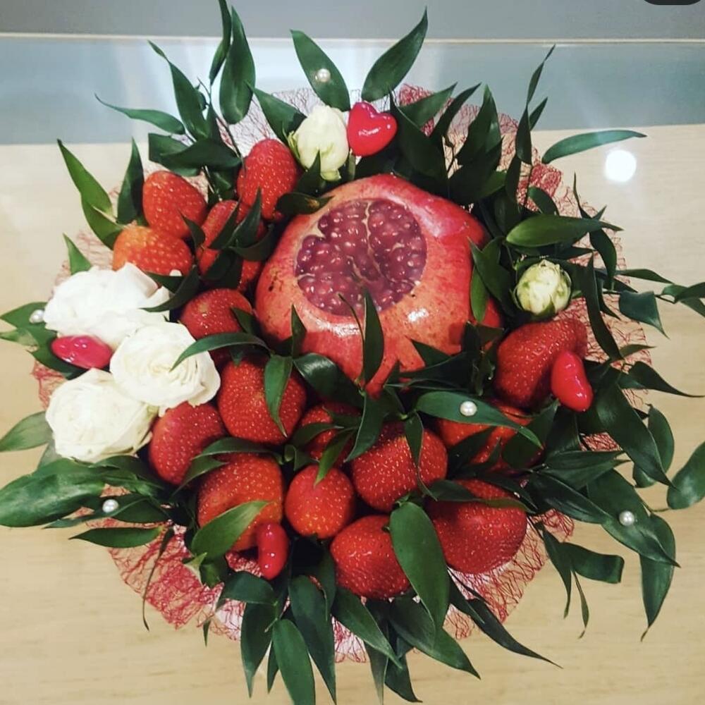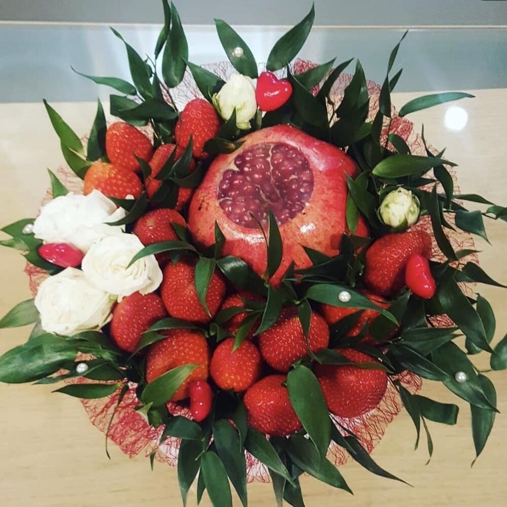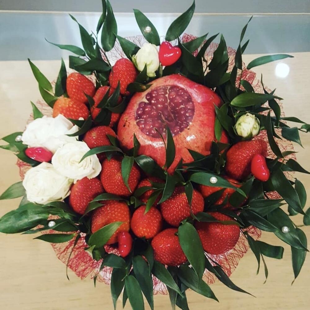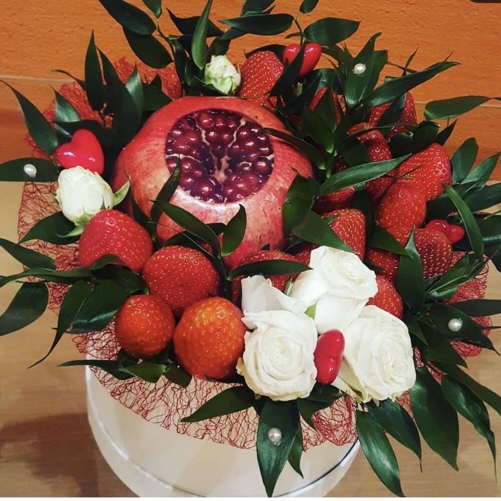 Granada - 1 un. Morangos selecionados - 500 gr. rosas arbustos - 5 un.
