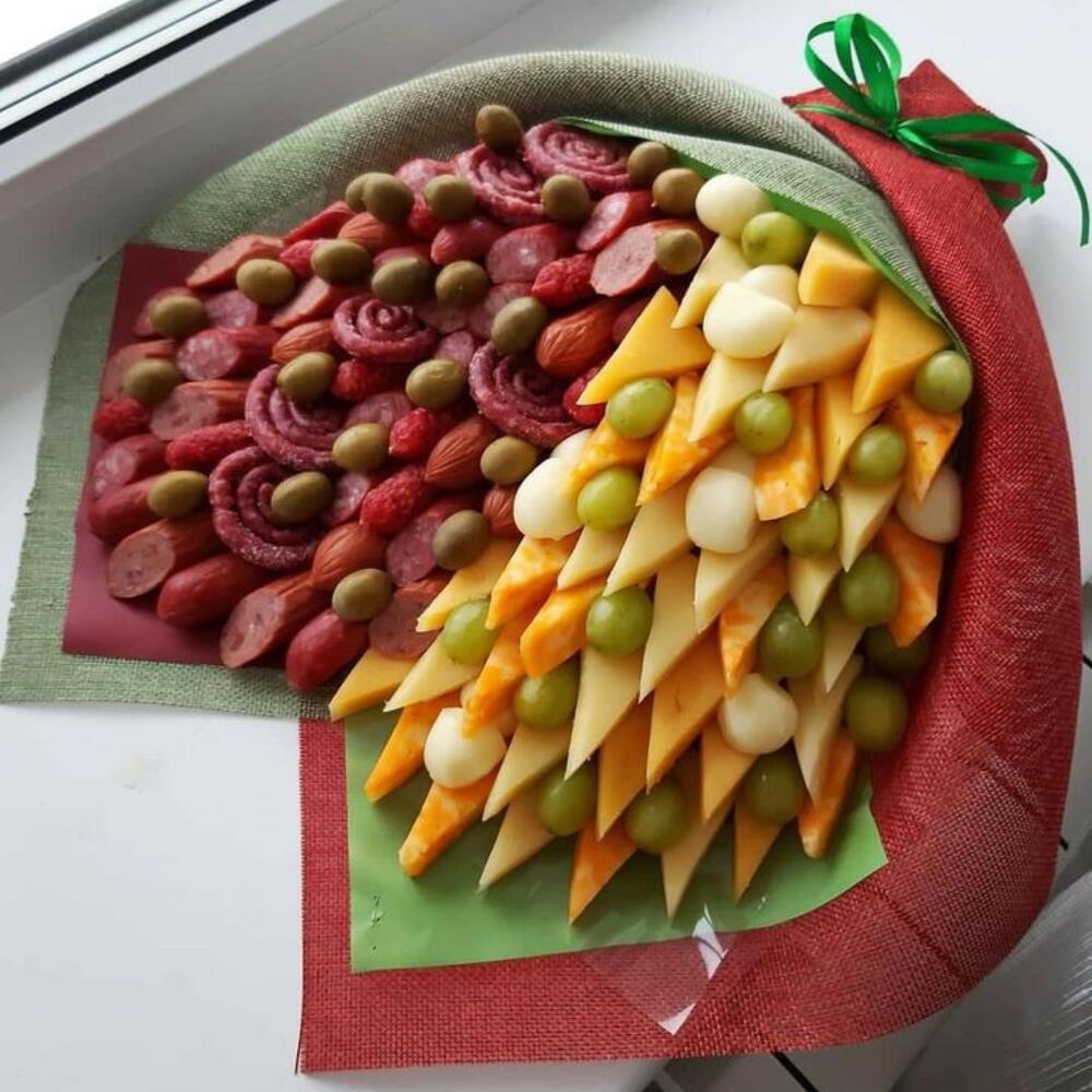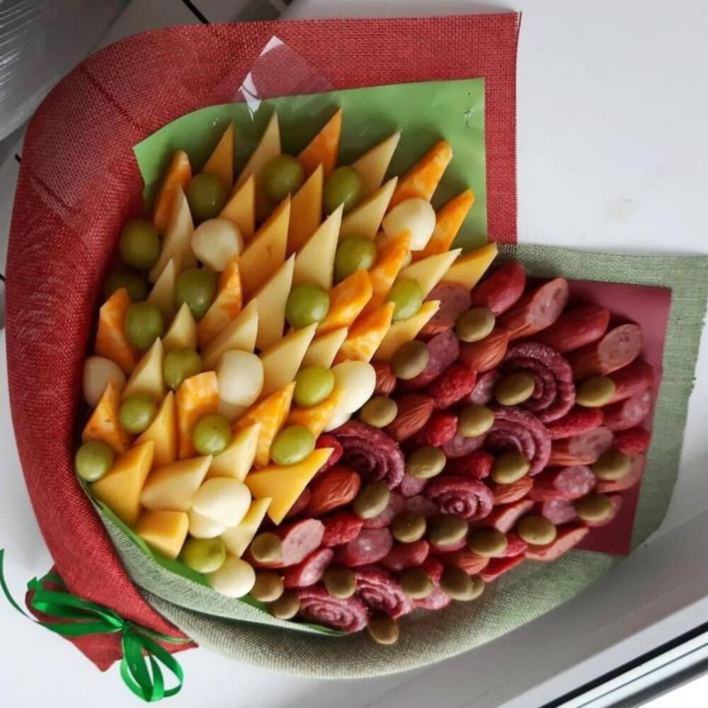Представляем вашему вниманию необычный и оригинальный подарок - мужской букет. В его состав входят различные виды высококачественных сыров: нежный голландский,швейцарский и сытный желтый общим весом. Для любителей мясных угощений мы добавили мини колбаски - ароматные, небольшие, с насыщенным вкусом, идеально подходящие для пикника или вечеринки, а также круглый кнакер. В качестве закуски вы найдете в букете зеленых оливок. Вишенкой на торте этого гурманского букета являются сырные шарики и сочный белый виноград. Мужской букет - идеальный подарок для настоящего ценителя вкуса!