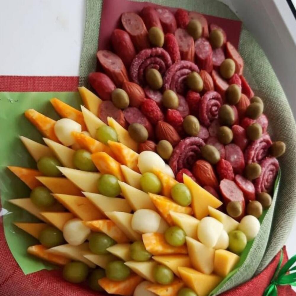 Bolinhas de queijo - 150 gr. Salsichas de caça - 300 gr. queijo holandês - 200 gr. uvas brancas - 150 gr. queijo amarelo - 200 gr. сыр швейцарский - 200 gr. azeitonas verdes - 150 gr. охотничьи колбаски мини - 250 gr. кнакер круглый - 150 gr.