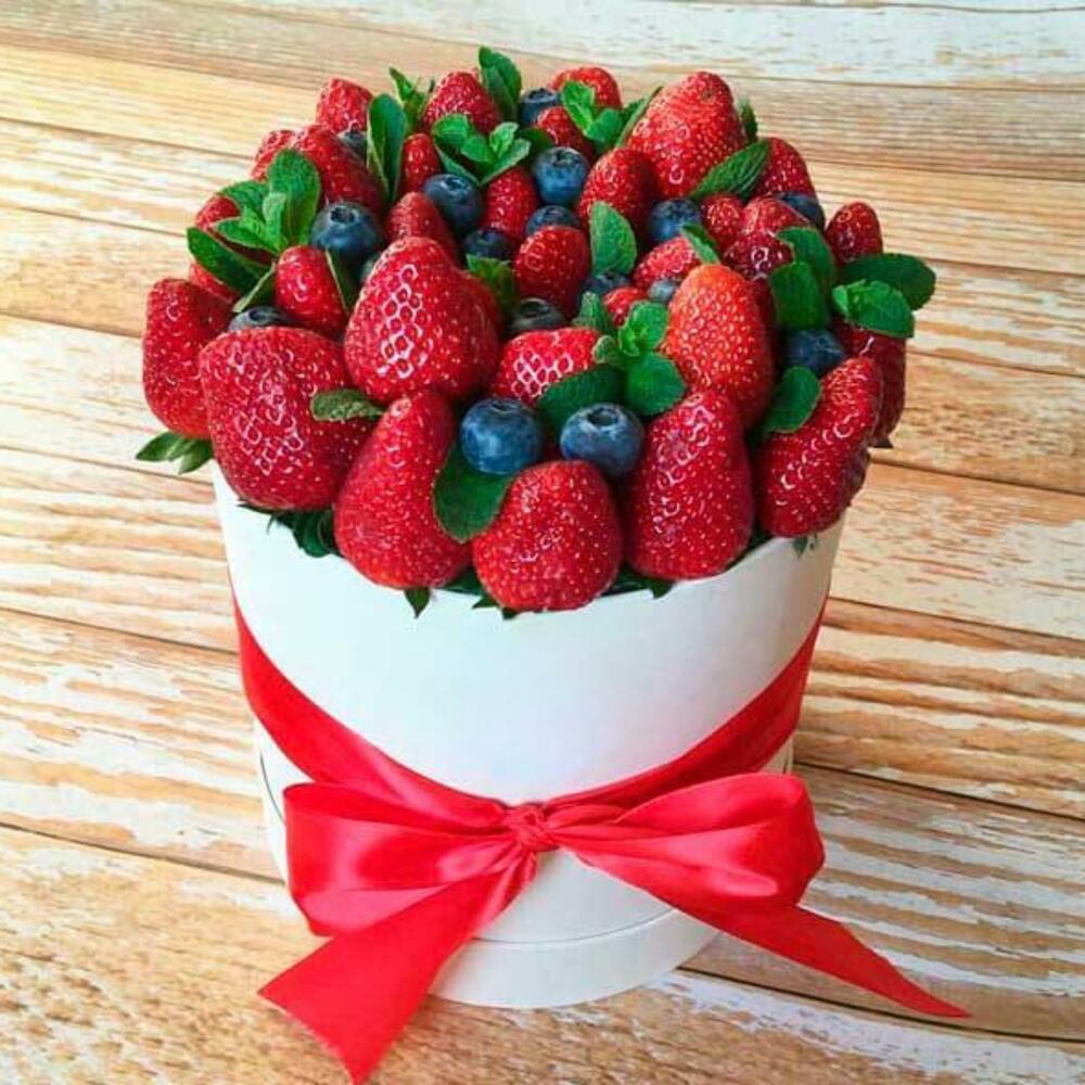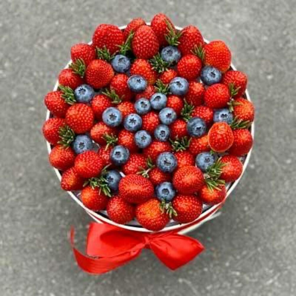 Симфония из ягод! Пышная клубника, сладкая голубика и свежая зелень собраны в стильную коробку, украшенную красной лентой. Такой подарок точно поднимет настроение и подчеркнёт заботу о близких!
