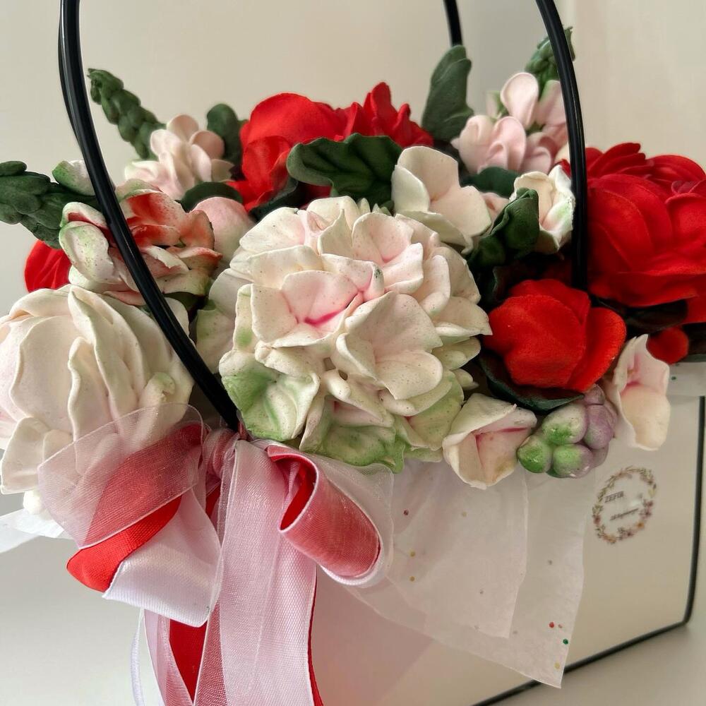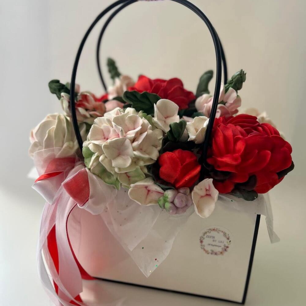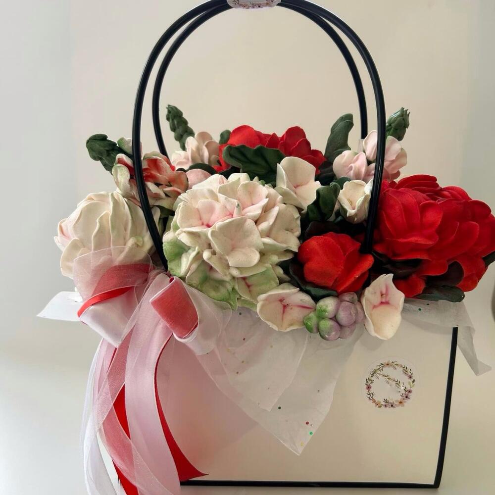 Наши зефирные цветы в сумке — это настоящее волшебство! Этот изысканный букет включает в себя ручную работу из зефира в ярких красных, нежных розовых и чисто белых оттенках, уютно расположившихся среди пышной зелени. Каждый цветок тщательно создан из мягкого зефира, чтобы создать потрясающее визуальное удовольствие, которое почти слишком красиво, чтобы его съесть. Представленный в элегантной белой сумке изящной прозрачной ручкой и украшенный красной лентой, этот букет станет волшебным подарком или центральным элементом, который покорит всех, кто его увидит.