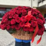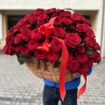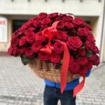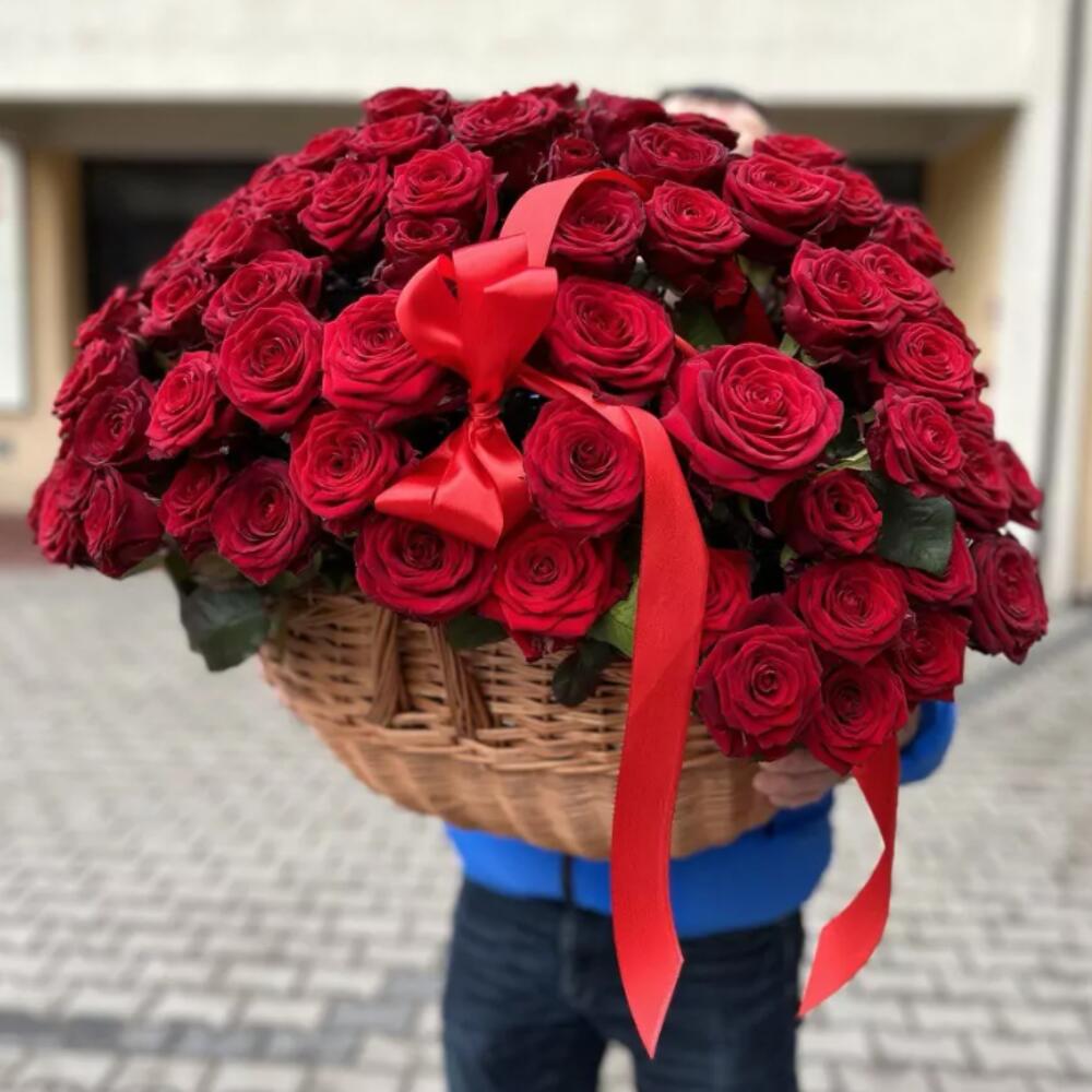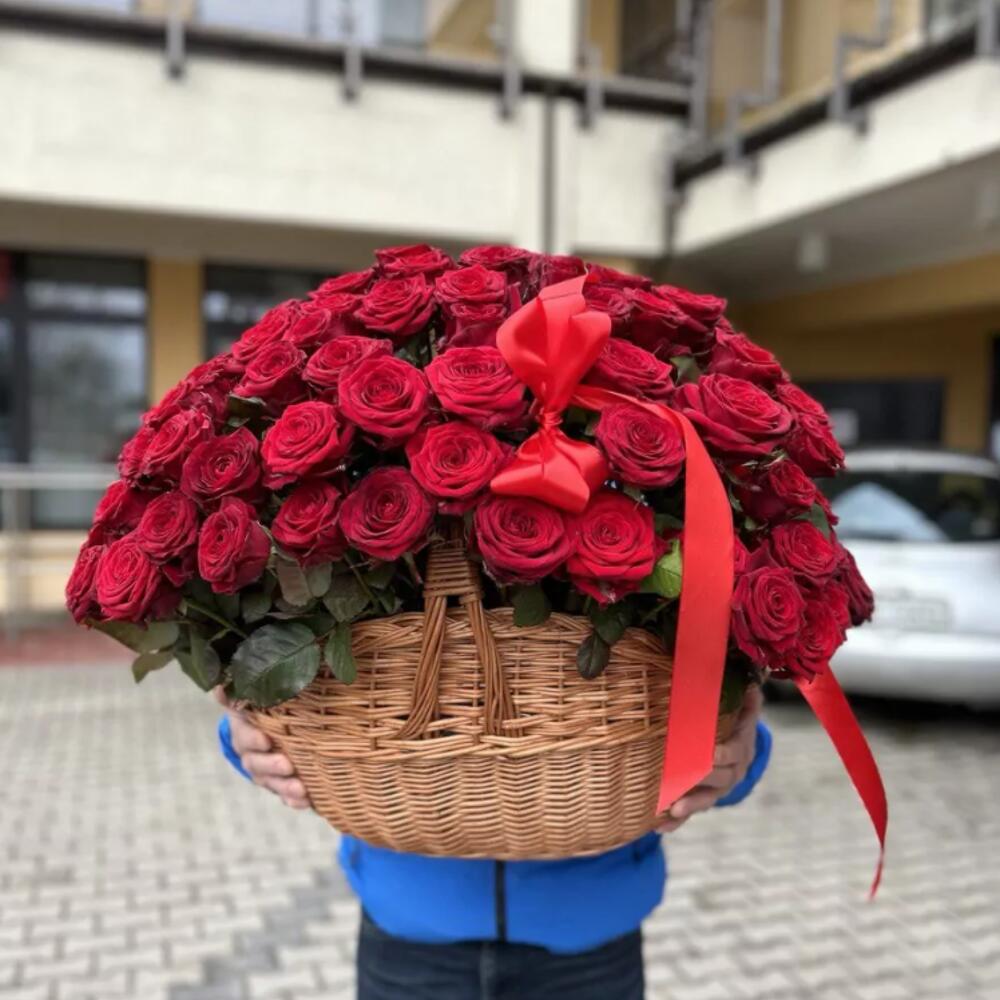 Na zdjęciu bukiet 100 czerwonych róż w koszu Skład: czerwone róże, zielone dodatki, kosz, gąbka florystyczna, wstążka. Możliwość dodać personalizowany liścik z dedykacją dla obdarowywanej osoby.