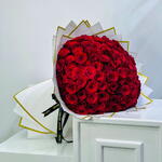 100 Premium Red roses hand bouquet beautifully wrapped with white and gold wrapping sheet and tied with black ribbon