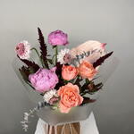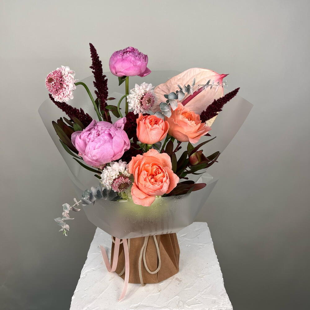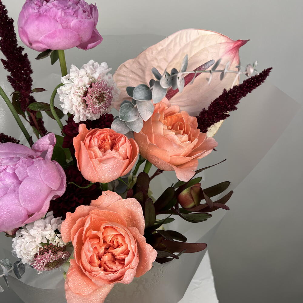 Folhagem - 1 un. Anthurium - 1 un. escabiosa - 3 un. amaranto - 3 un. peônias rosas - 2 un. hortênsia - 2 un.