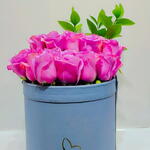 Flower basket with 30 purple roses and ruscus leaves