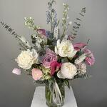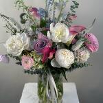 Desfrute da beleza natural deste encantador buquê dos Destaques dos Floristas, cuidadosamente elaborado à mão com uma mistura exótica de flores para transformar qualquer ambiente em um jardim sereno. Este arranjo luxuoso apresenta 3 Eringiums nítidos, 5 ranúnculos radiantes, 3 peônias brancas imaculadas, uma mistura elegante de folhagens, 8 encantadoras verônicas, 5 elegantes lírios-cala e 6 deslumbrantes rosas de jardim. A fenomenal combinação de tons e texturas torna este buquê uma obra-prima e perfeito para abrilhantar qualquer ocasião. Deixe este buquê de alegria embelezar seu espaço ou transmitir seus sentimentos sinceros hoje.