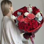 ranúnculo - 1 un. pink expresion - 3 un. ramos de eucalipto - 4 un. alhelí branco - 3 un. rosa vermelha francesa - 6 un.