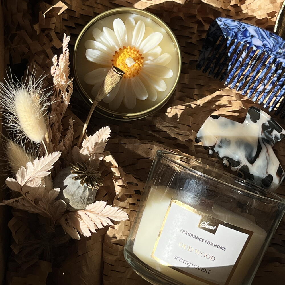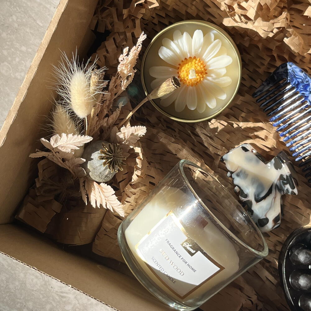 The set includes: • Soy candle • Candle in a glass • Hair claw clip • Shower massage soap with a scent of cinnamon • Ceramic decorative dish • Brush The set is thoughtfully wrapped in kraft paper and presented in a box, beautifully adorned with dried flowers.