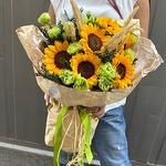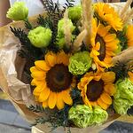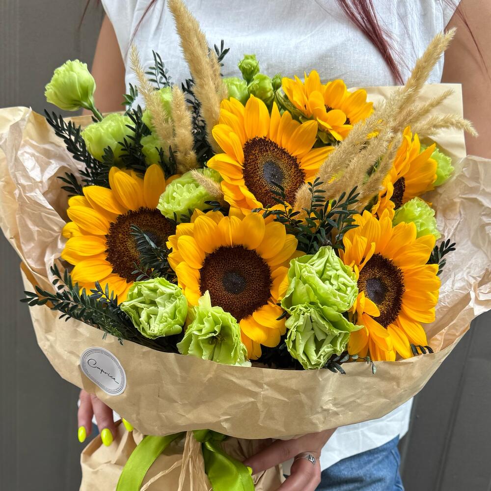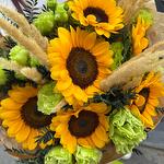 Lisianthus - 4 un. Girassol - 6 un. verde decorativo - 2 un. grama dos pampas (flores secas) - 3 un.