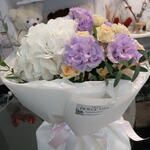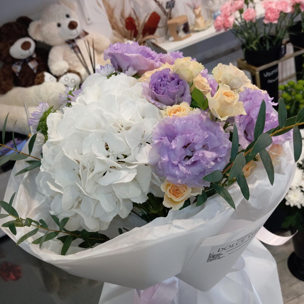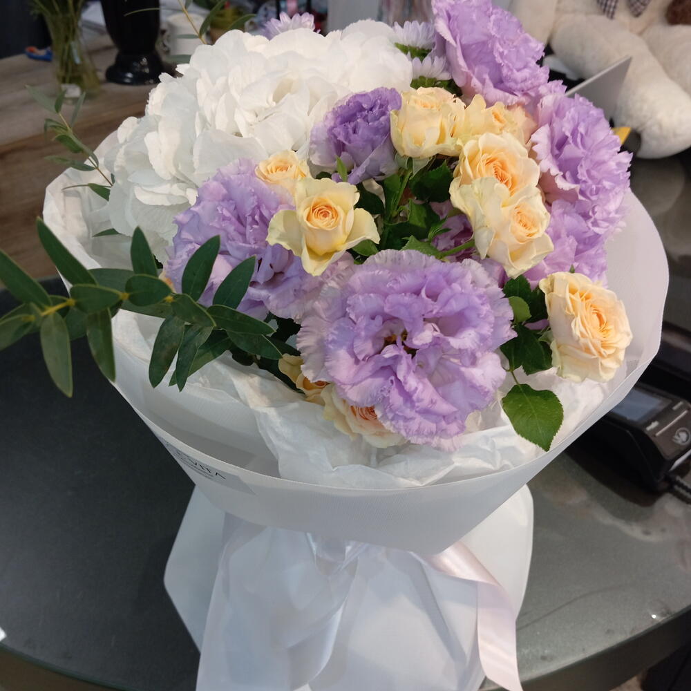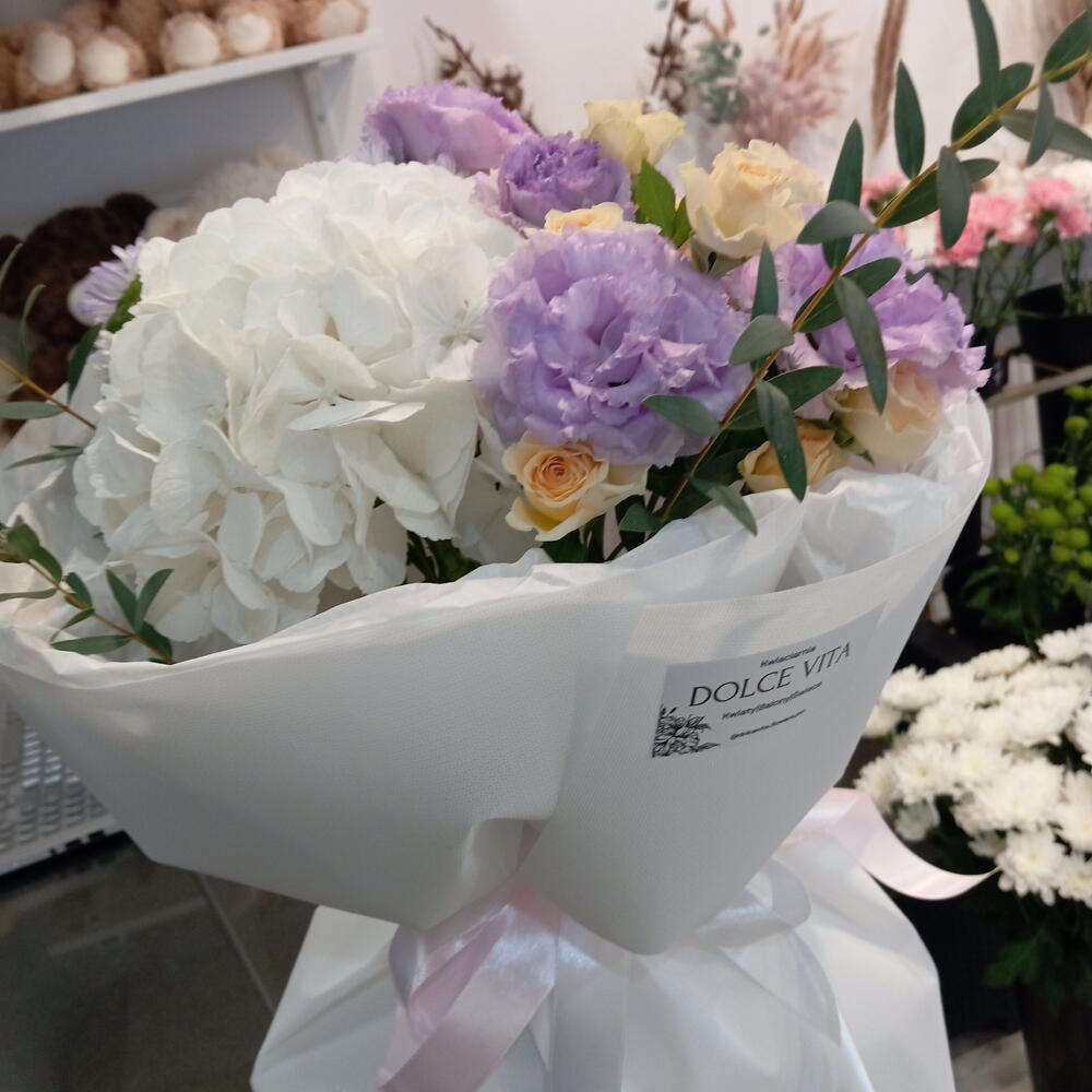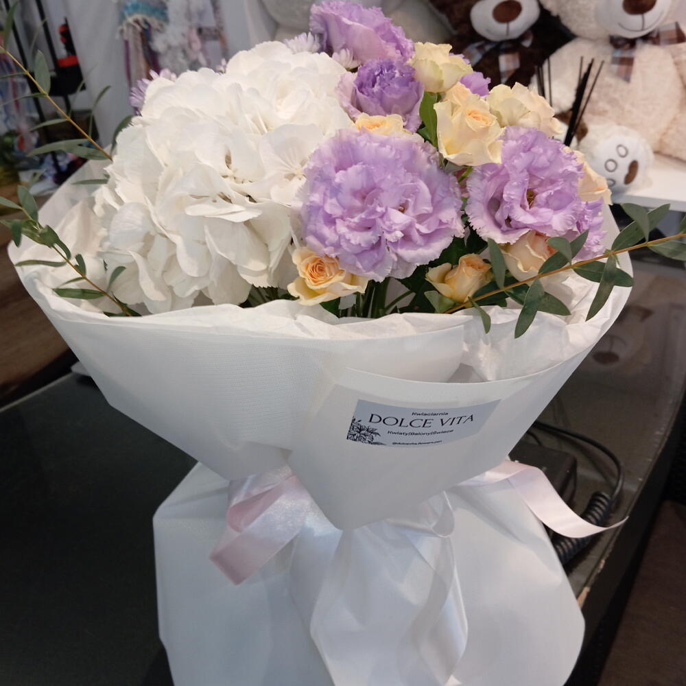 Eustoma - 2 un. folhagem decorativa - 3 un. hortênsia - 1 un. rosa goląskowa - 3 un.
