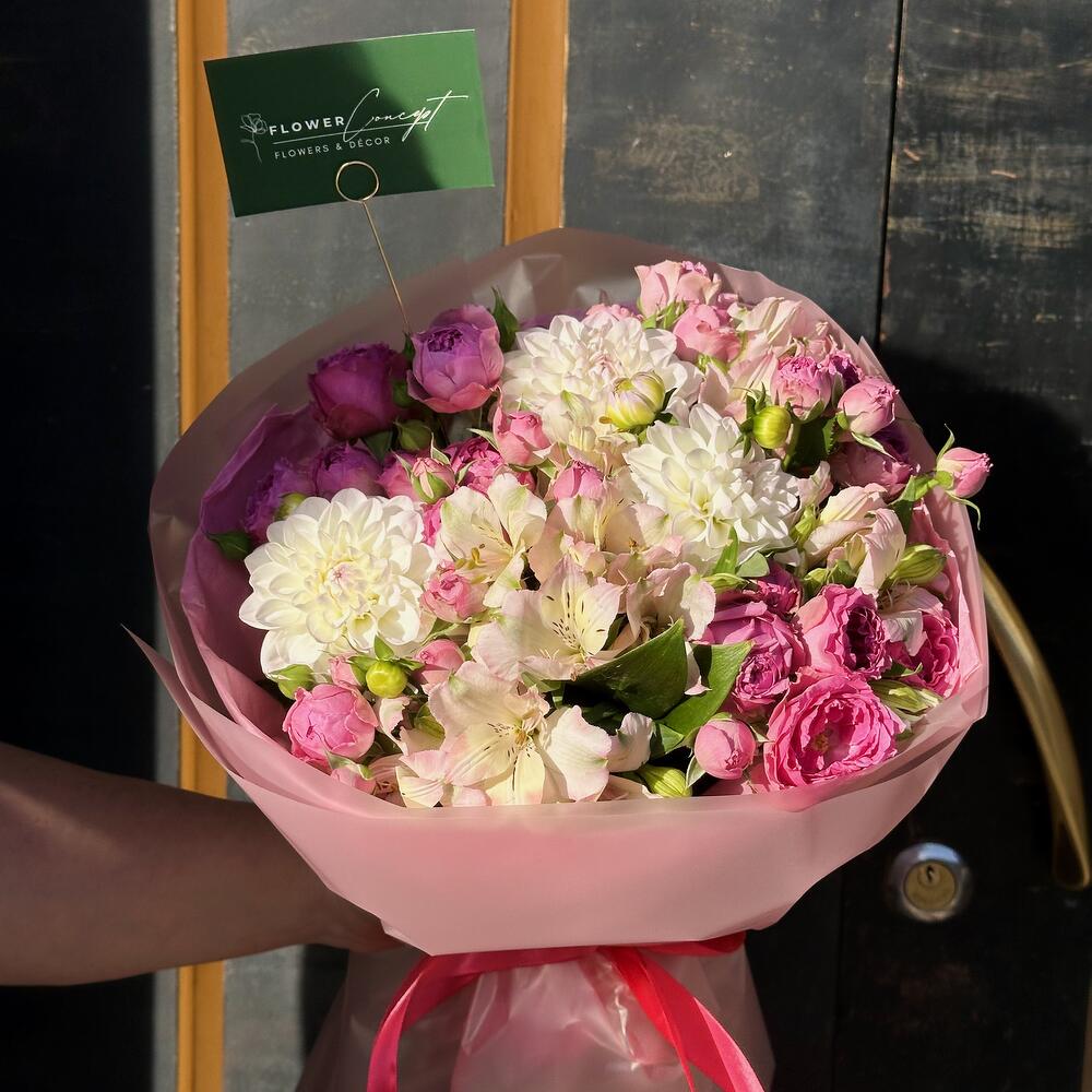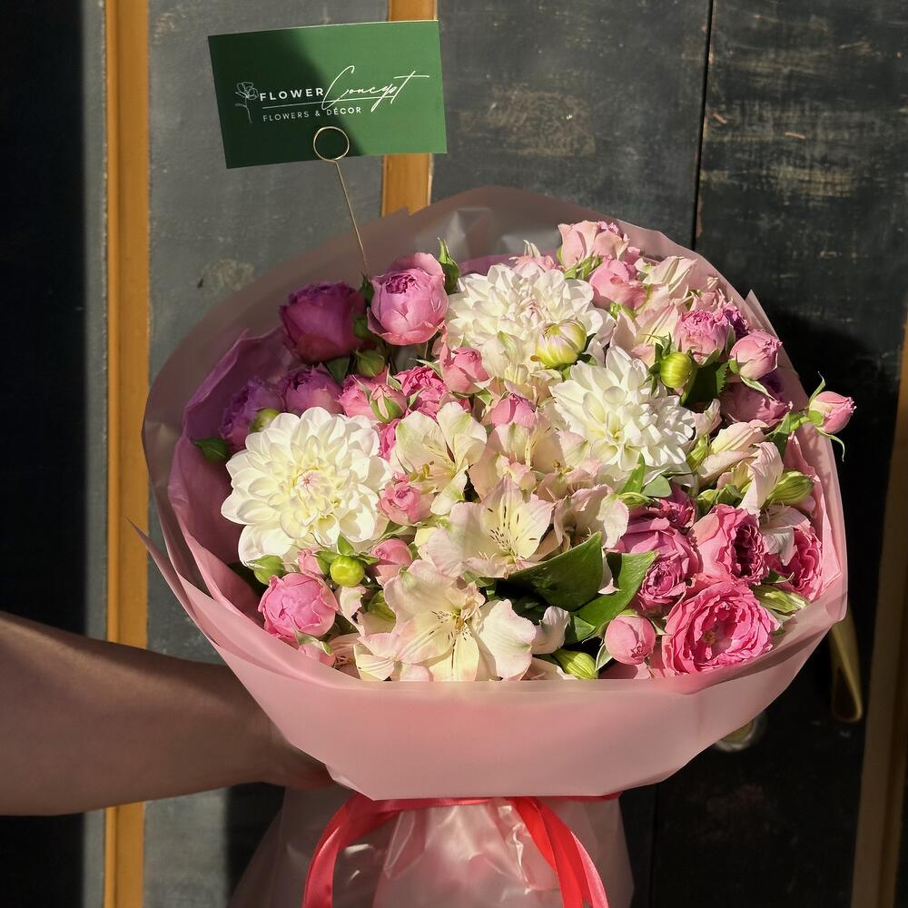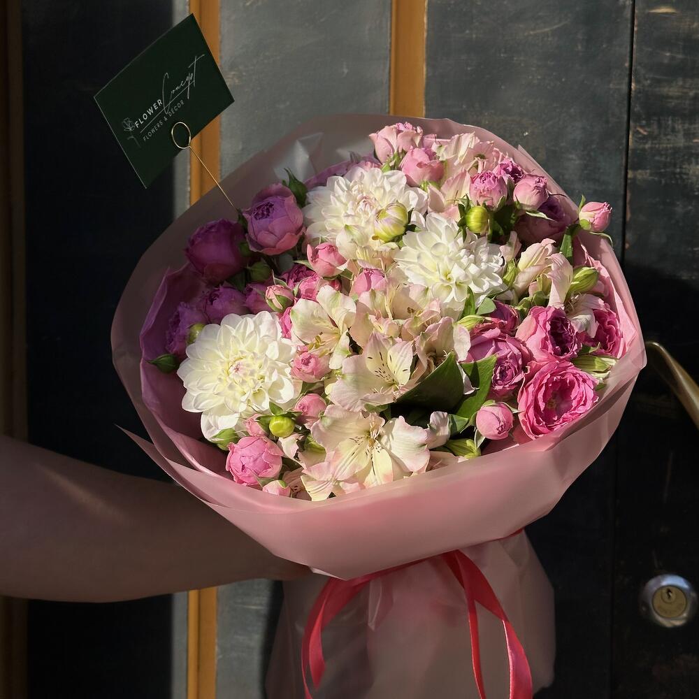 Это тёплая и выразительная композиция, в которой сочетаются изысканные кустовые розы и эффектные георгины. Бархатистые лепестки георгинов добавляют глубины и текстуры, а розы наполняют букет романтикой и мягкостью.