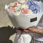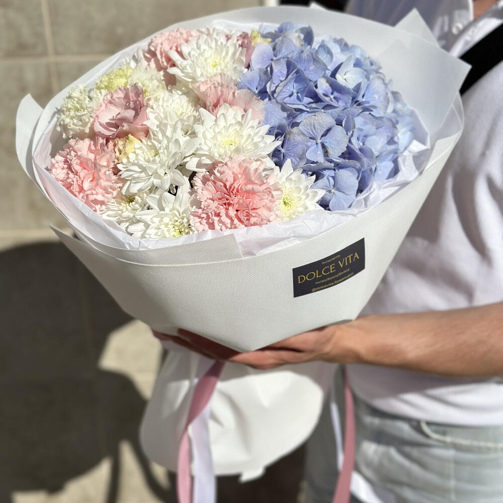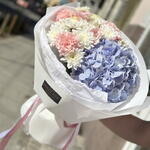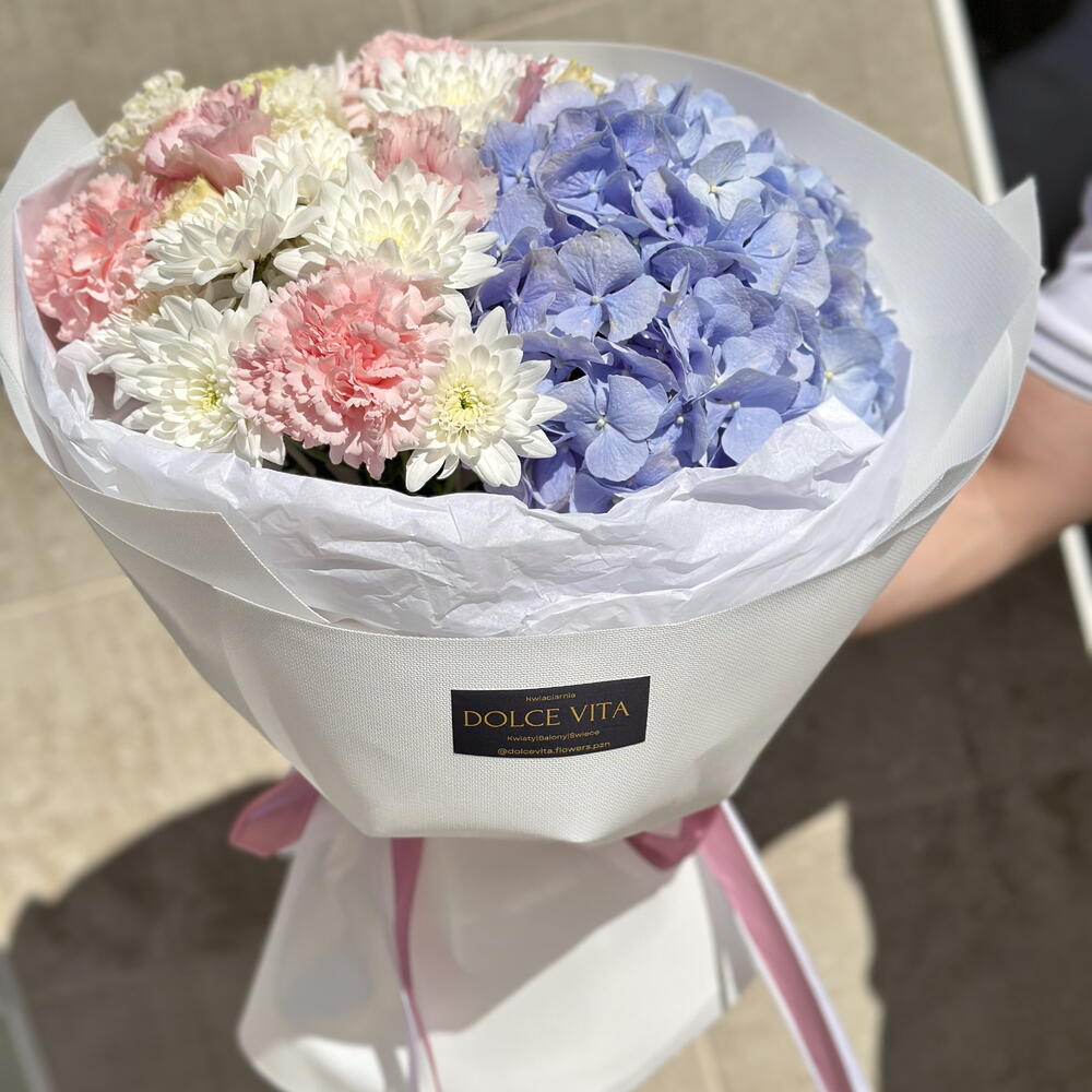 mix de eustomas - 2 un. crisântemo - 2 un. cravos - 4 un. hortênsia - 1 un.