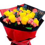 Nice hand tied boquet with yellow roses and white and red spray roses mixed with some ruscus