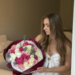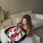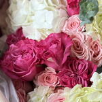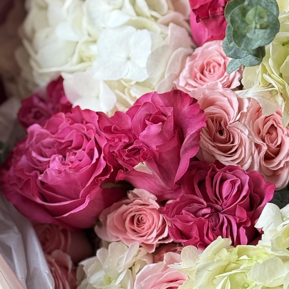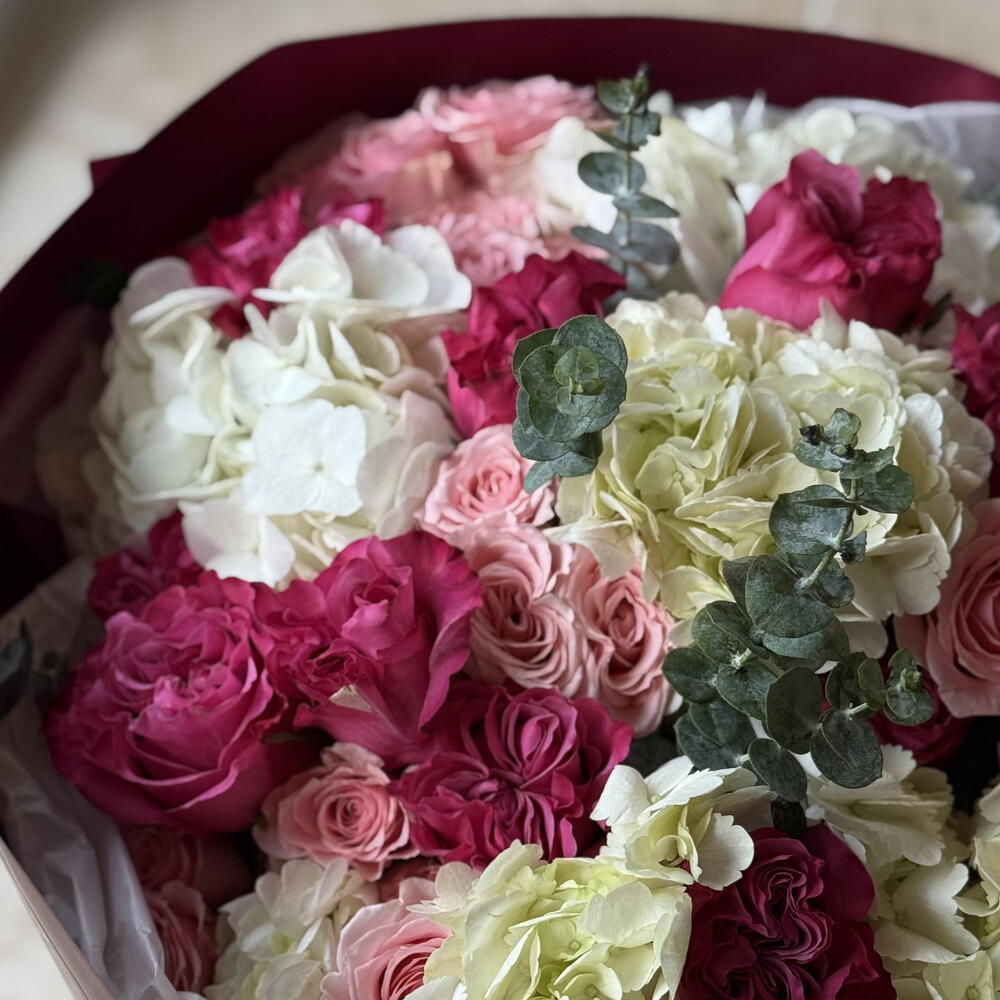 Eucalyptus - 5 un. Hydrangea - 5 un. rosas spray - 7 un. rosas de jardim - 10 un.