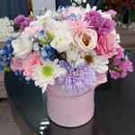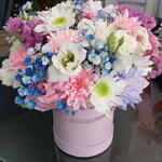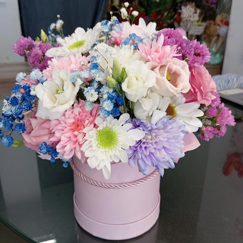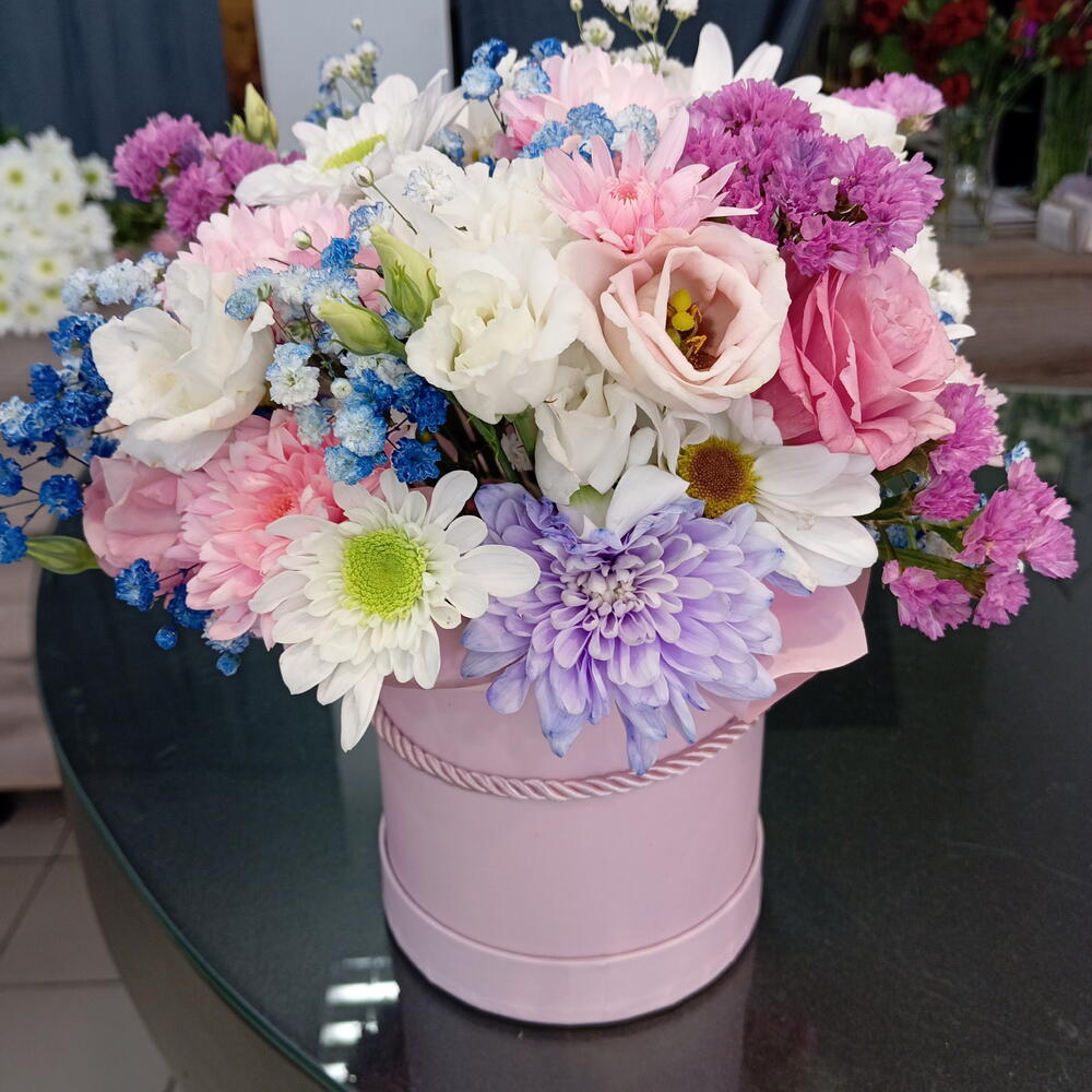 Eustoma - 2 un. cravo - 3 un. gipsofila - 1 un. folhagem decorativa - 2 un. mix de crisântemos - 2 un.