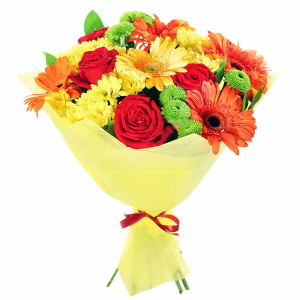Gerbera - 5 un. crisântemos - 5 un. rosas vermelhas - 5 un. acessórios verdes - 5 un.