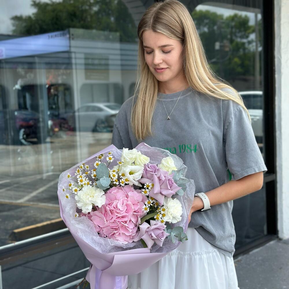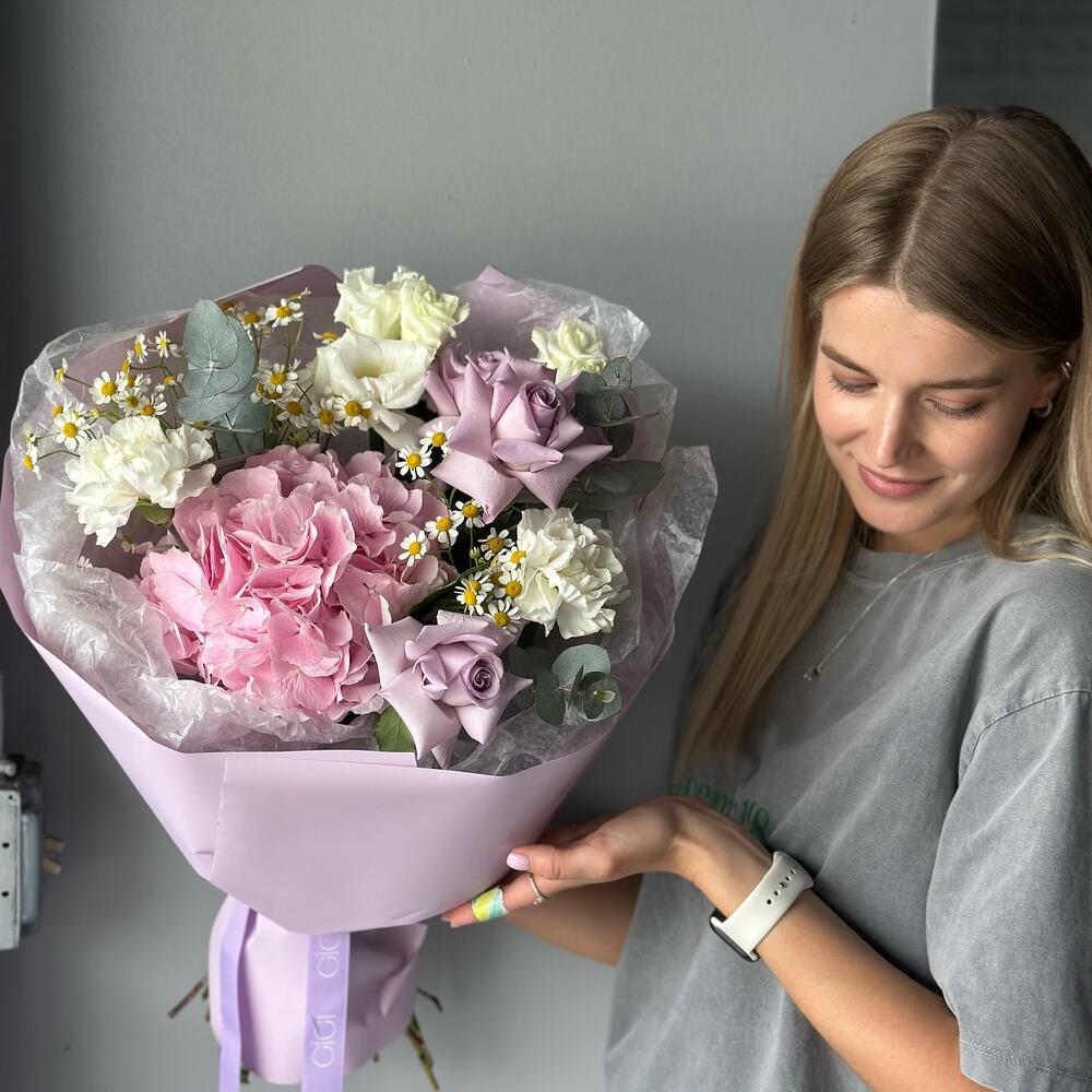 Eustoma - 1 un. Eucalyptus - 2 un. cravos - 3 un. hortênsia rosa - 1 un. camomilas - 2 un. rosas - 3 un.