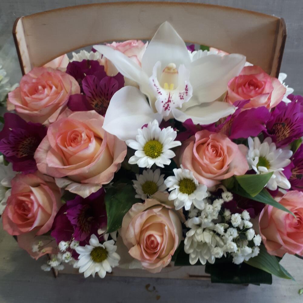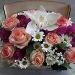 Alstromeria - 15 un. Gypsophila - 3 un. Cor verde - 5 un. Camomila - 5 un. Orquídea branca - 1 un. quadro feito à mão - 1 un. роза душистая - 15 un.