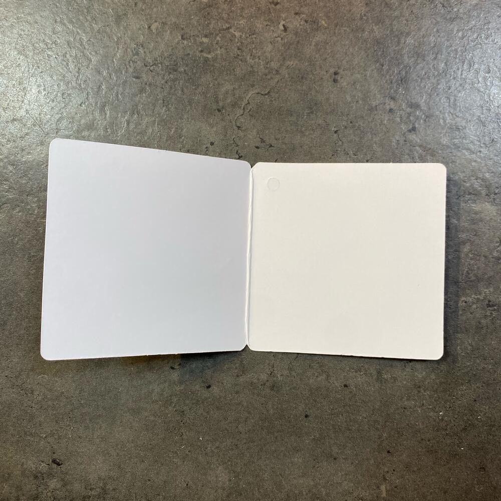 Cartão de papelão com dimensões de 6 por 6 centímetros. Sua pequena mensagem colada ou escrita à mão.