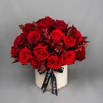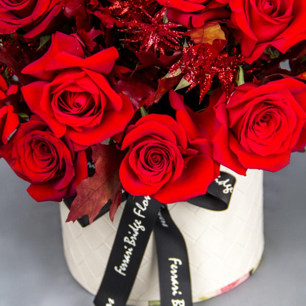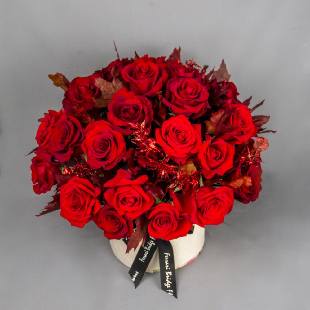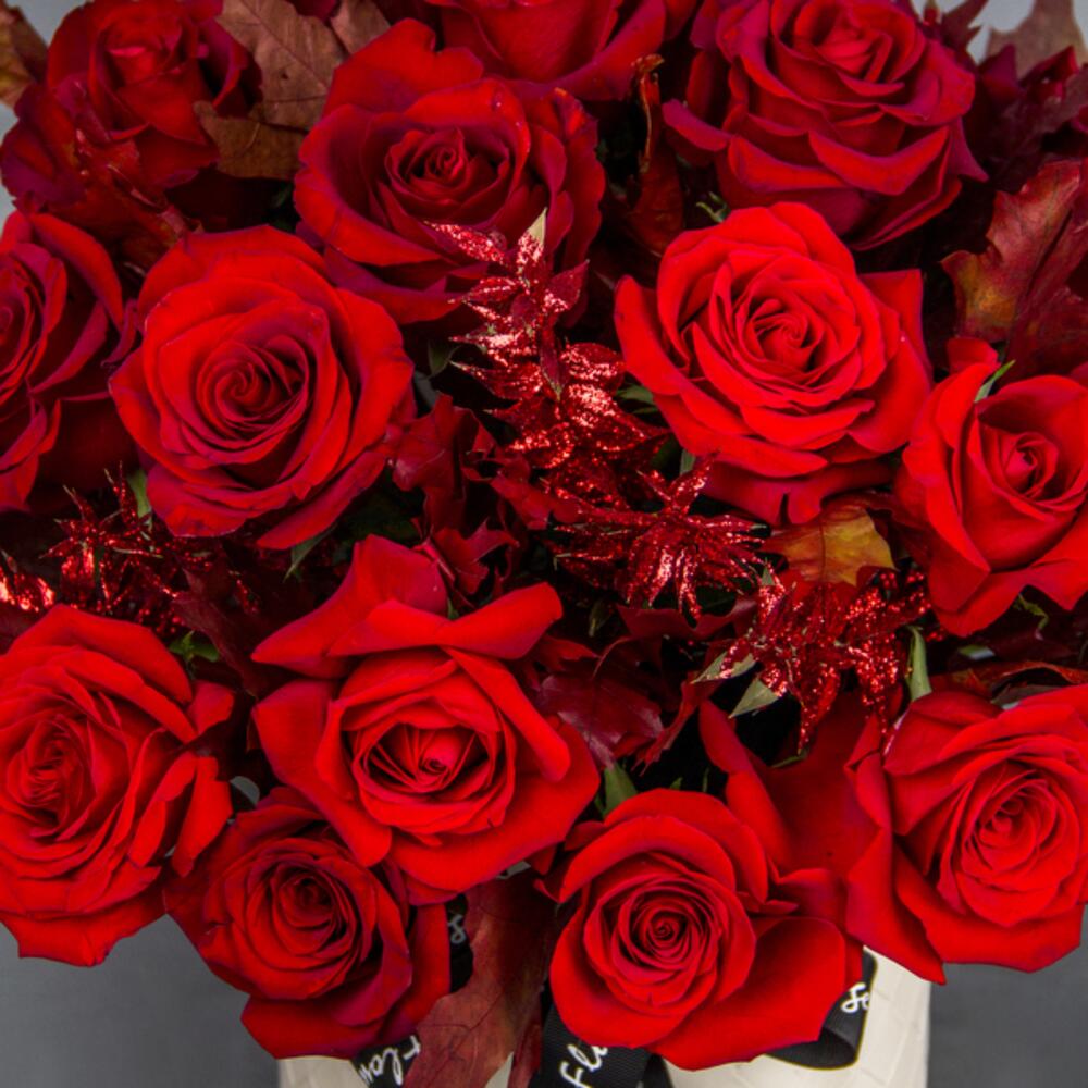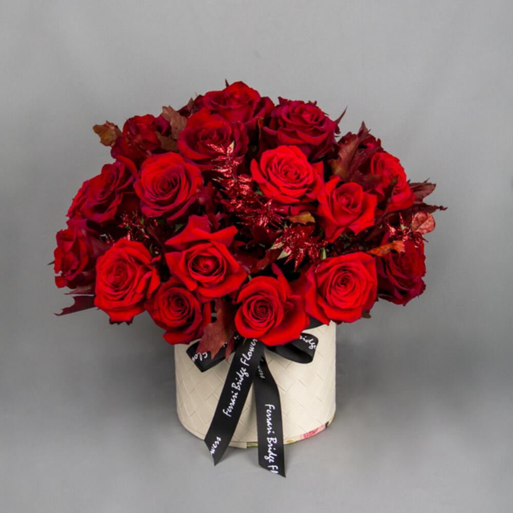 A classic box arrangement with red Roses and leaves.