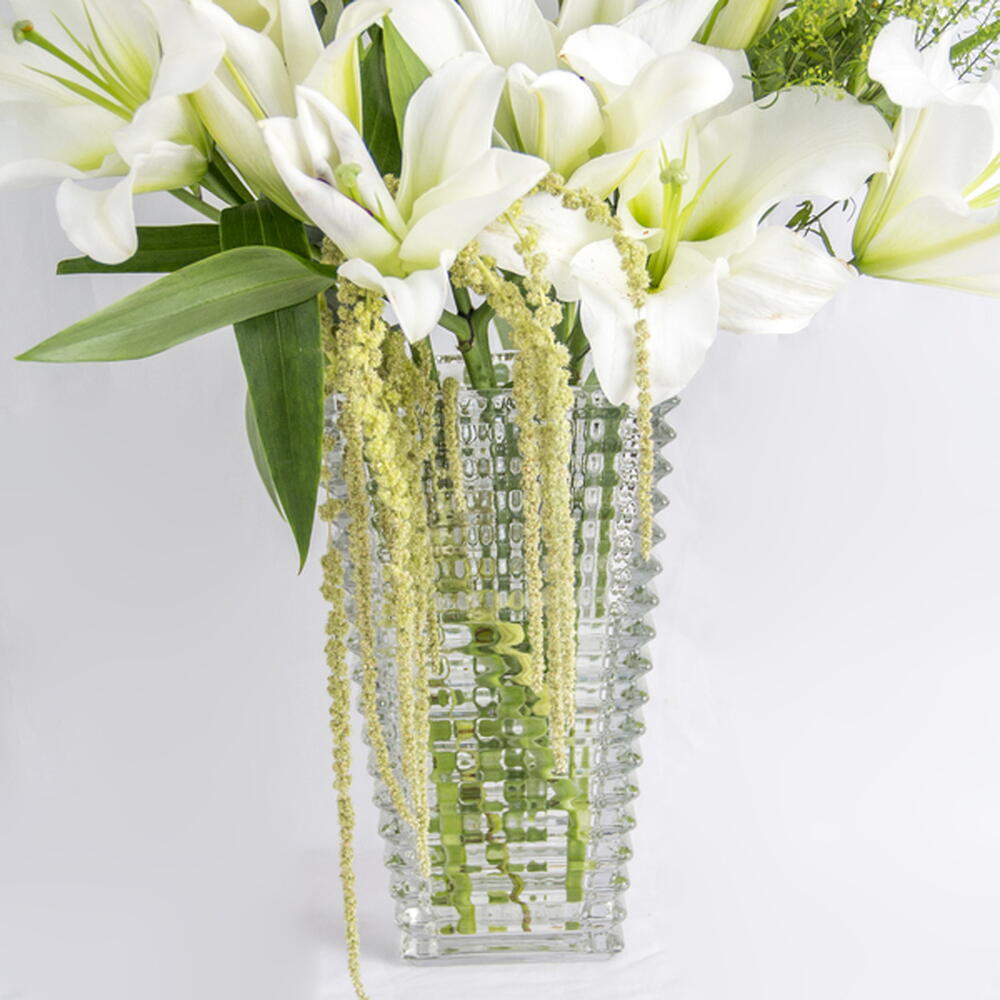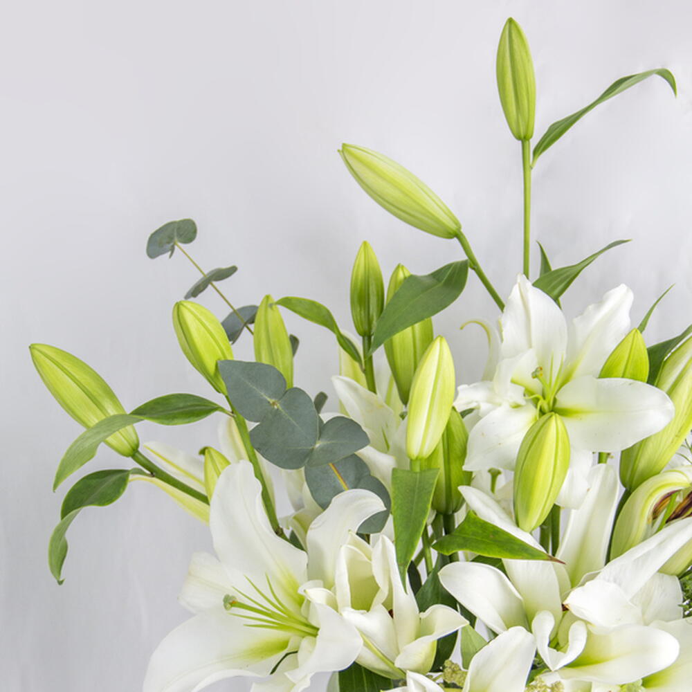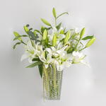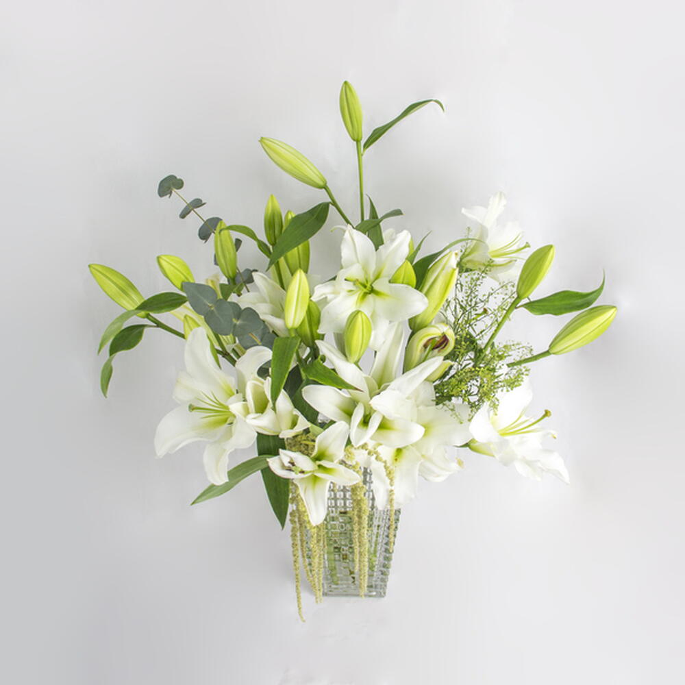 Elegant white lily arrangement in a contemporary vase, perfect for Ramadan celebrations.