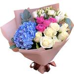 Eustoma - 3 un. hortênsia - 1 un. eucalipto - 2 un. rosa branca - 7 un. embalagem decorativa - 1 un. różowy róż - 4 un.