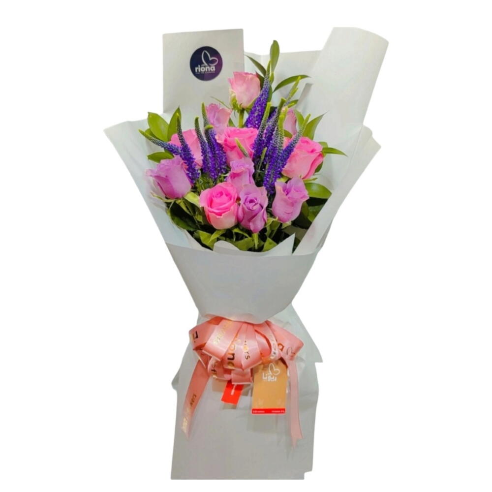 Pink and purple roses wrapped together with Veronica blue