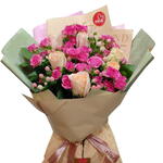 Nice hand tied boquet with foosiya spray roses, pink roses and pink hypericum