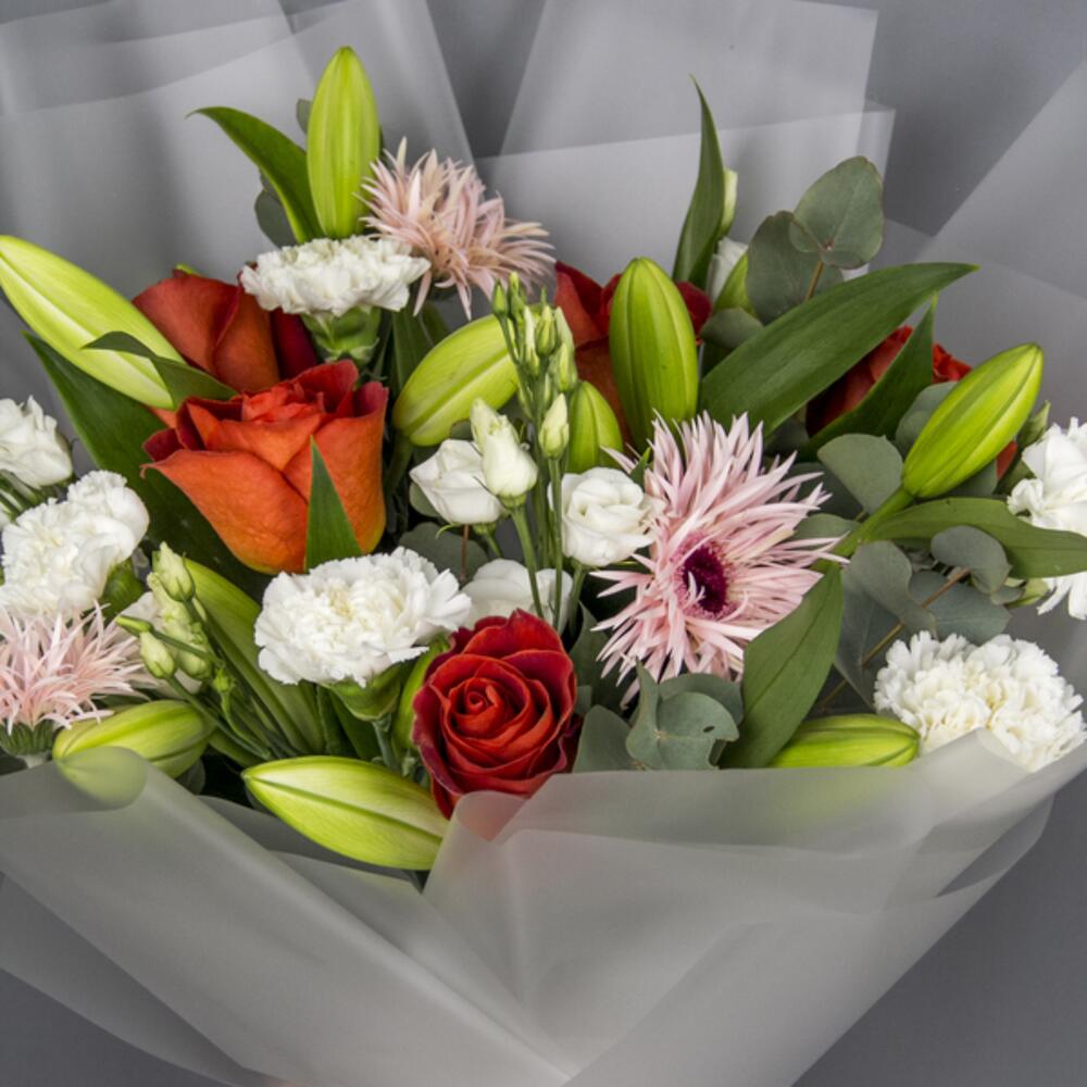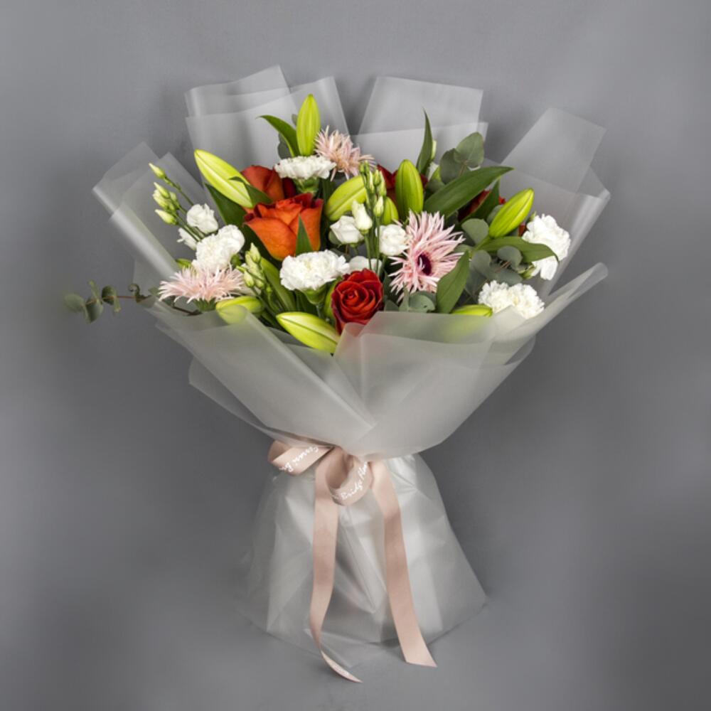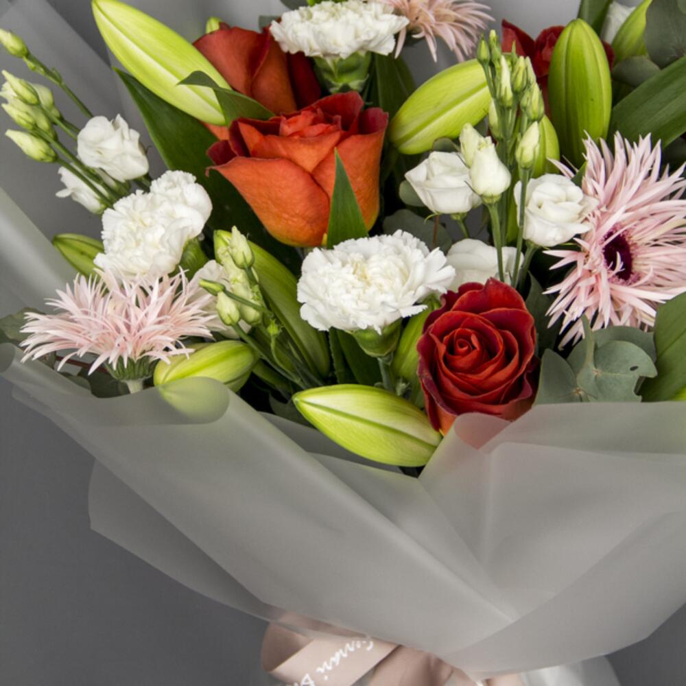 Ribbon - 1 un. Eustoma - 3 un. Eucalyptus - 1 un. Lírio - 3 un. Gerbera - 3 un. Embalagem - 7 un. rose - 6 un. carnation - 6 un.