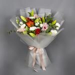 A combination of Roses, Lilies, Gerbera, Carnation and Leaves in a bouquet with transparent wrapping and pink ribbon.