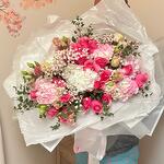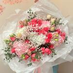 Gypsophila - 10 un. Rosa - 25 un. Hortênsia Rosa - 10 un. Lisianthus Alice branco - 10 un. Eucalipto Baby Blue - 10 un.