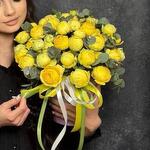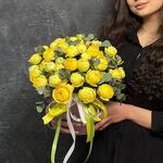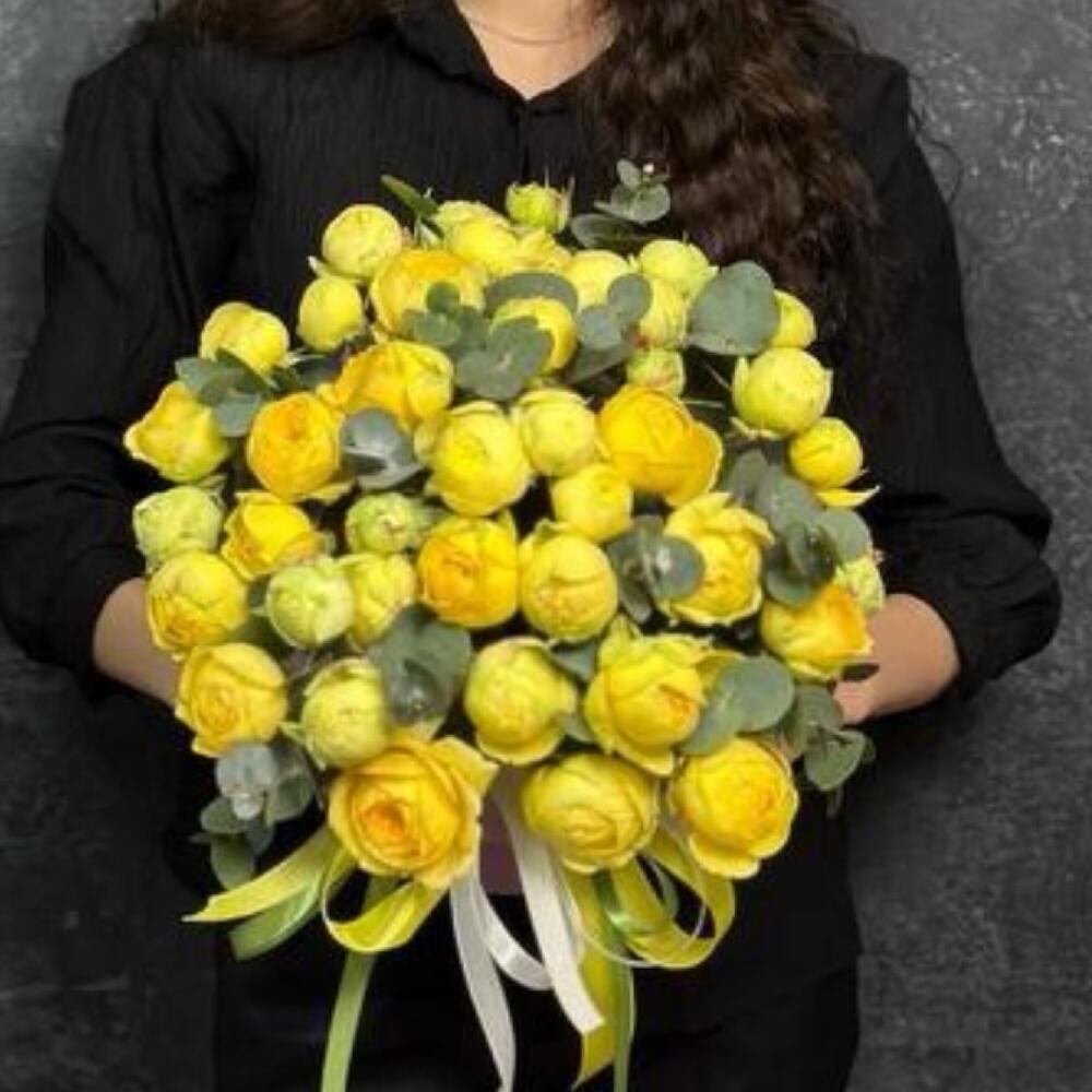 Eucalipto - 3 un. Caixa de chapéu - 1 un. Fita de cetim - 2 un. Oásis floral - 1 un. rosas em forma de peônia amarelas - 8 un.