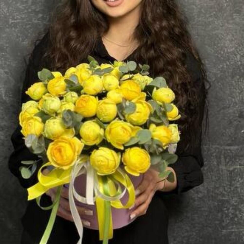 Букет в шляпной коробке необычайно красивых пионовидных роз. Композиция дополнена ароматными веточками эвкалипта, что придает букету элегантность.