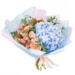 hortênsia - 1 un. acessórios verdes - 2 un. embalagem decorativa - 1 un. rosa spray rosa - 9 un.